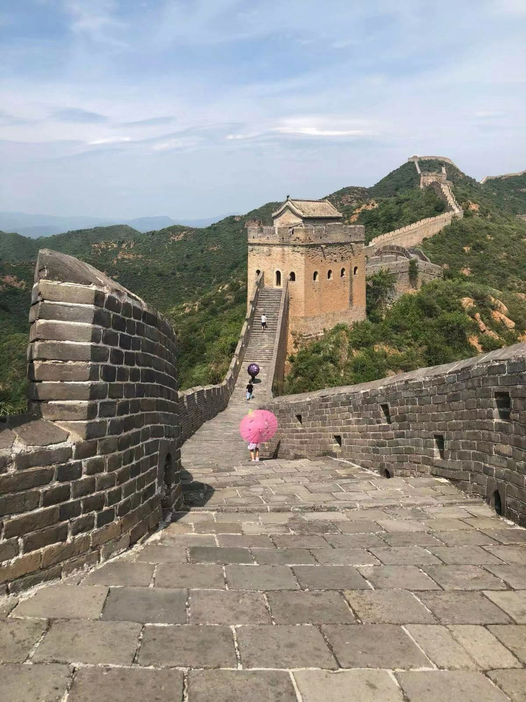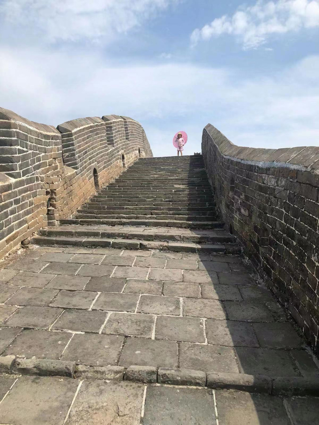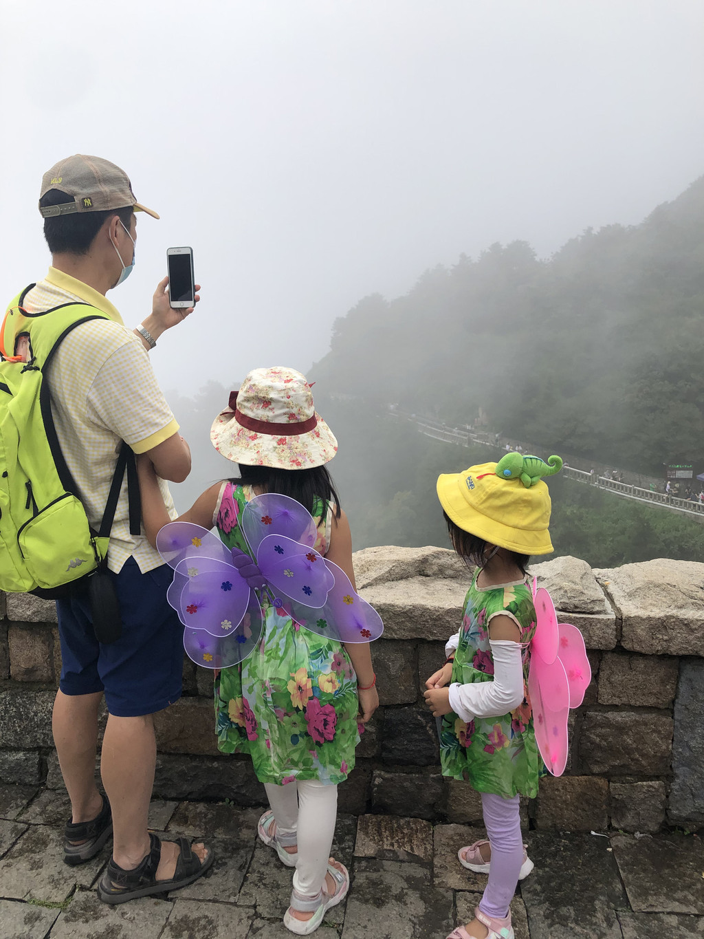 早上9:15出发,13:00到达金山岭长城的停车场。坐电瓶车去到景区门口,坐缆车上到了长城,游人很少,妹妹很努力的,自己一个人打着小粉红雨伞一直往前走,下坡、上坡从小金楼跑到大金楼了,真没想到她小个子能量那么大,好像打了鸡血一样。我们在大金楼坐下,看看长城内外。两姐妹一心就想买小礼物,姐姐买了把剑,还在长城边耍了一段剑。妹妹点名要买姐姐去年来金山岭长城时买的金山岭长城模型玩具,当然是心想事成。