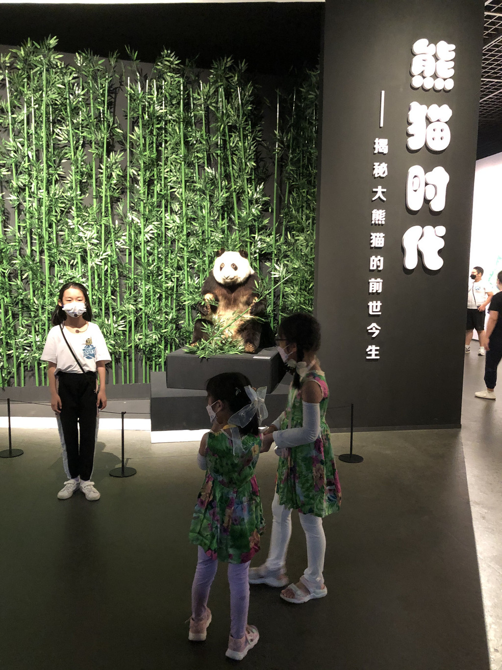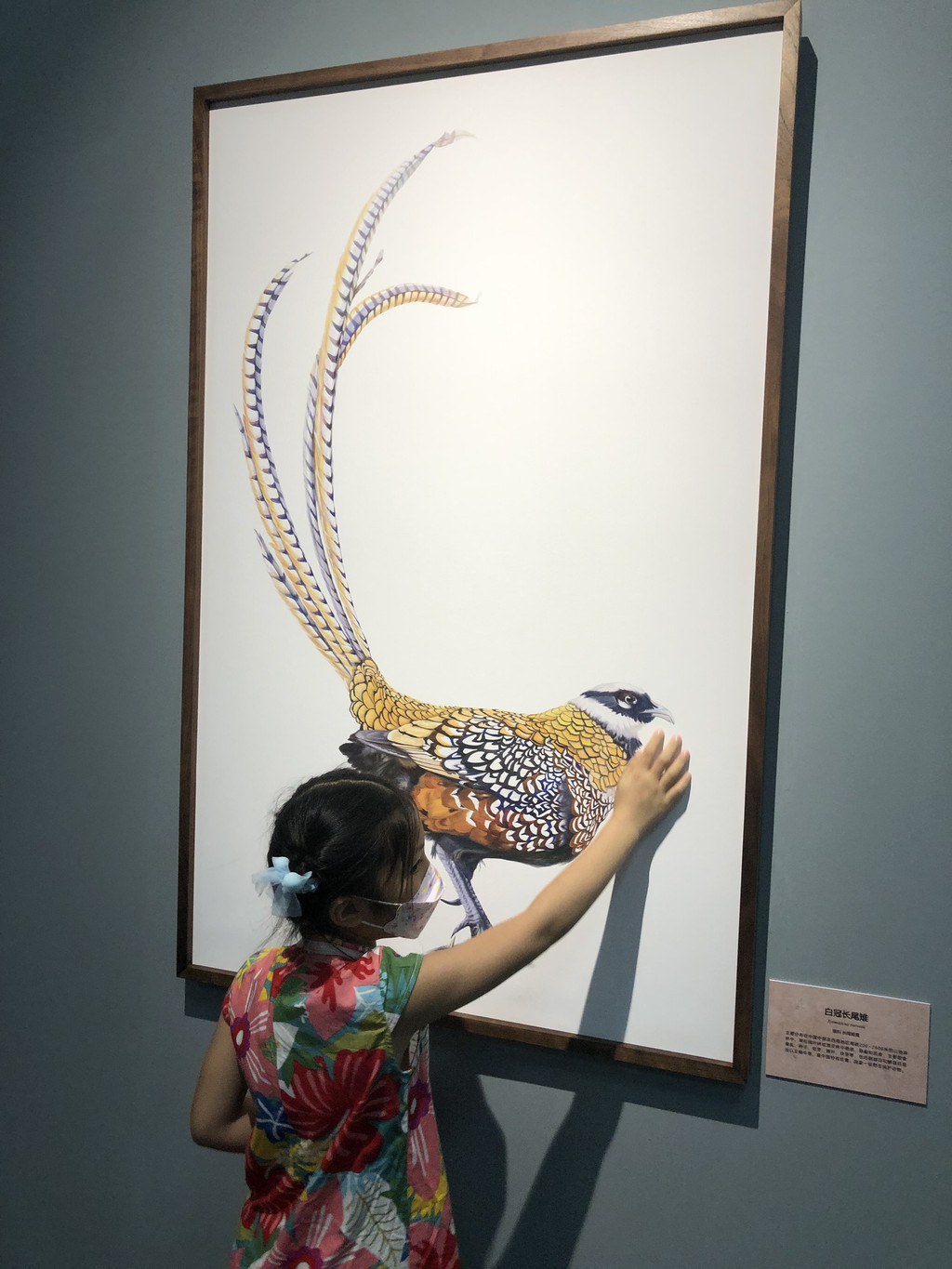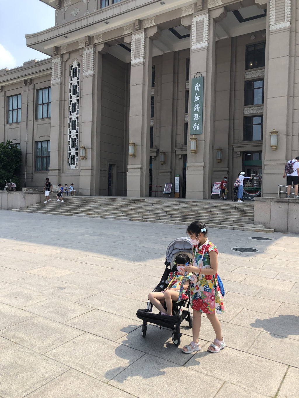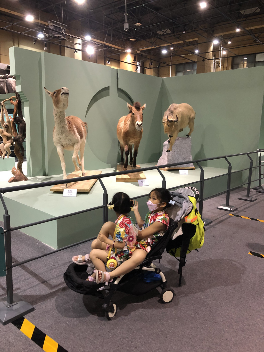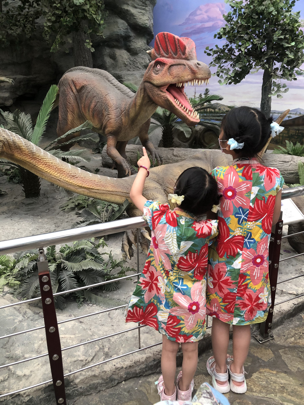9:18分,打车去北京自然博物馆。近三天的门票已经预约完了,打电话去问可以现场买临时参观票,小孩10块钱一张,大人20块钱一张。姥姥排队买票,姥爷排队进场,买完票刚好到我们进场了。暑假很多小朋友来参观,博物馆的藏品、动物标本很多,姐妹俩去到恐龙公园,如同回家般什么恐龙都知道。姐姐喜欢特展馆的标本画。