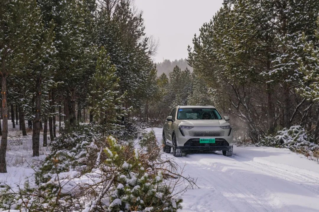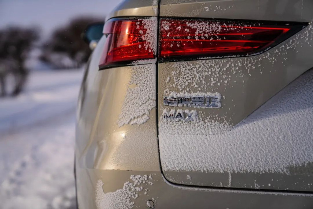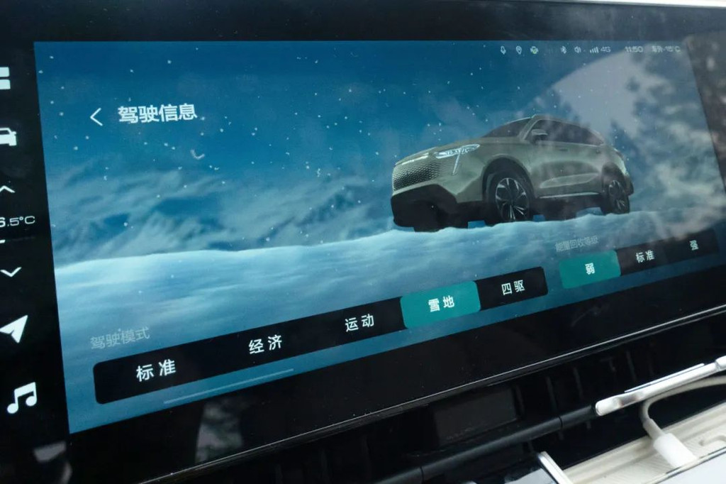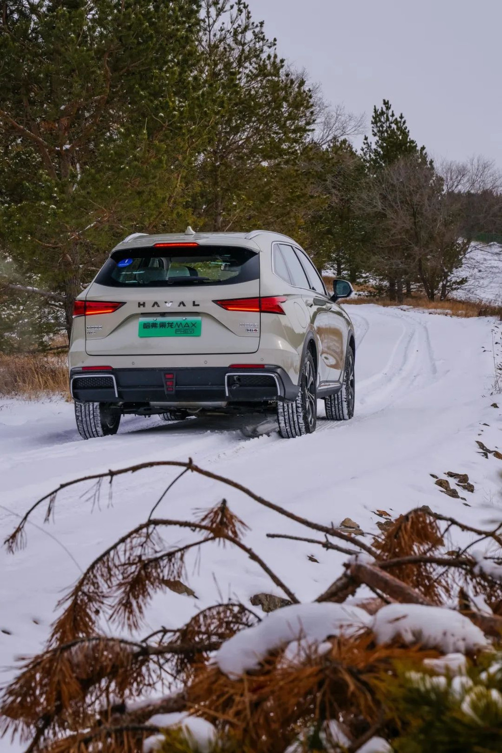 景色美,但危机四伏。幸好哈弗枭龙MAX的Hi4电四驱,它的雪地驾驶模式帮了我们的大忙。在这种模式下,动力输出柔缓,收起加速踏板,能量回收的减速度也很柔和,确保车辆在雪地上的行驶安全。虽然没有雪地胎,但是iTVC智能扭矩矢量控制系统会根据车轮打滑情况智能地分配动力,让车轮的抓地极限增高不少。有几次在路面上一侧是雪,另一侧已经露出路面,这种情况下,踏下加速踏板,车身保持平稳,系统智慧地调整两侧车轮的驱动力,保证我们的安稳出行。