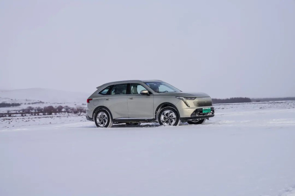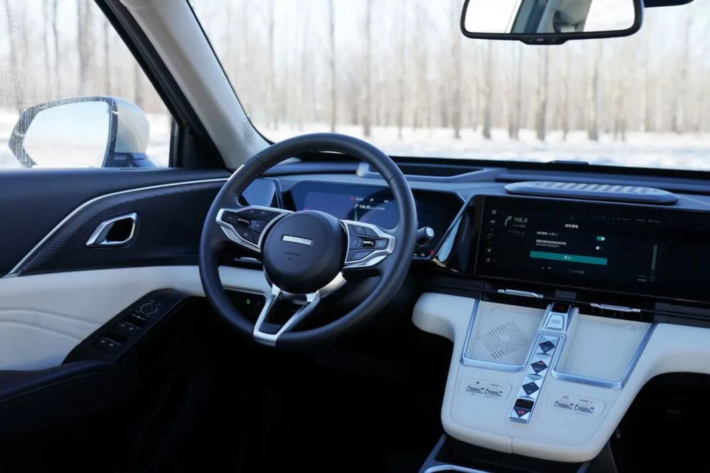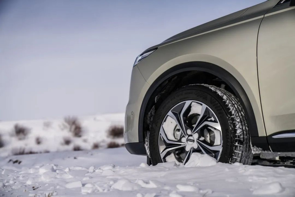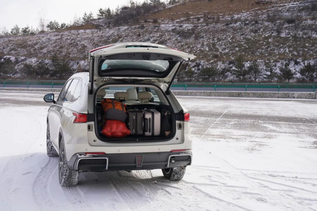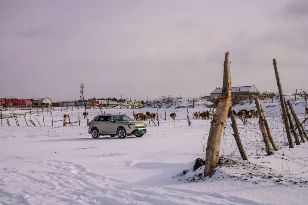 景色美,但危机四伏。幸好哈弗枭龙MAX的Hi4电四驱,它的雪地驾驶模式帮了我们的大忙。在这种模式下,动力输出柔缓,收起加速踏板,能量回收的减速度也很柔和,确保车辆在雪地上的行驶安全。虽然没有雪地胎,但是iTVC智能扭矩矢量控制系统会根据车轮打滑情况智能地分配动力,让车轮的抓地极限增高不少。有几次在路面上一侧是雪,另一侧已经露出路面,这种情况下,踏下加速踏板,车身保持平稳,系统智慧地调整两侧车轮的驱动力,保证我们的安稳出行。