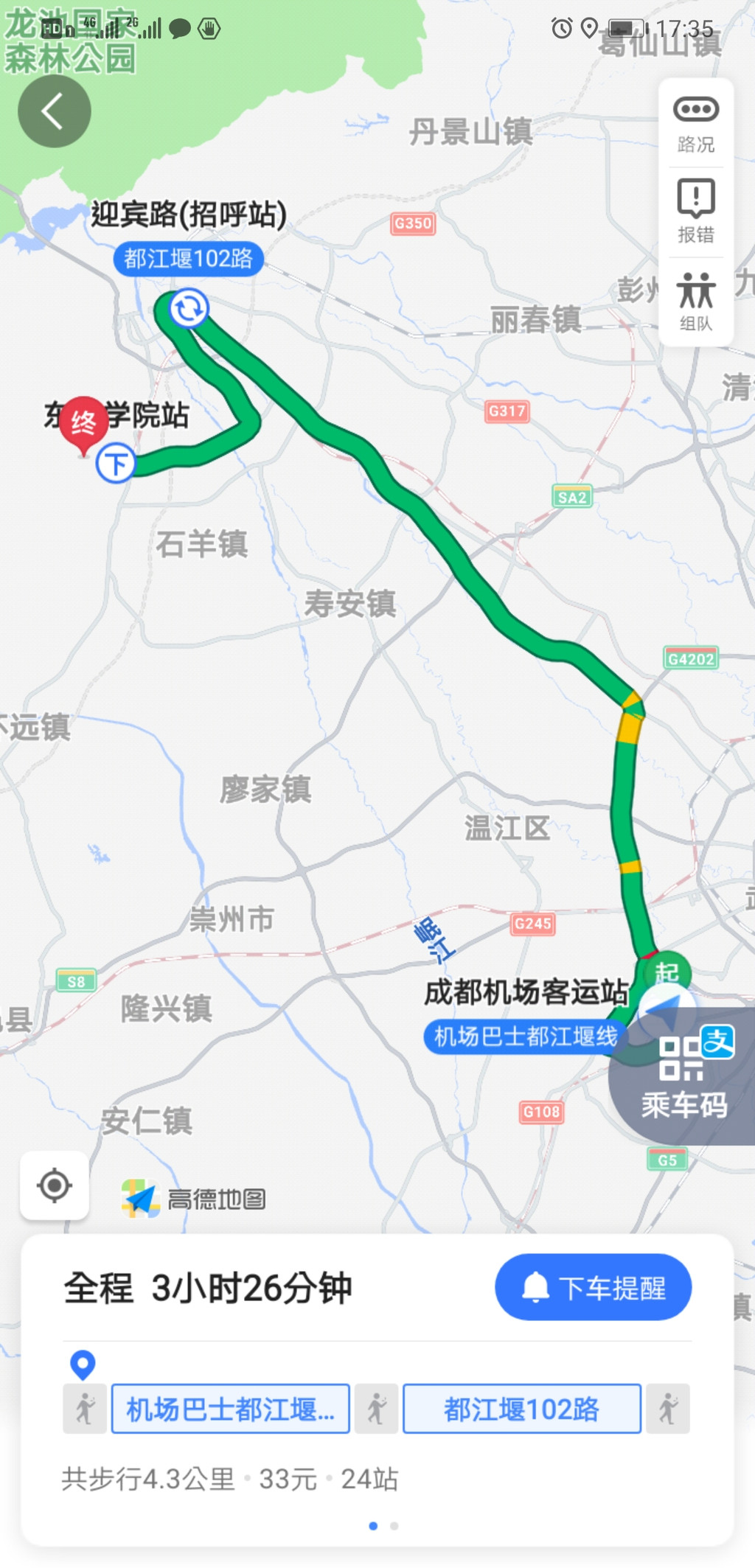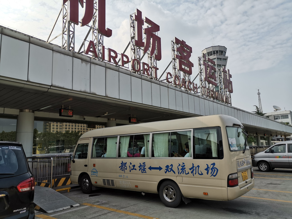 步行800m到长途汽车站(机场客运站),购买17:30发车的中巴车,¥27至都江堰客运站18:35