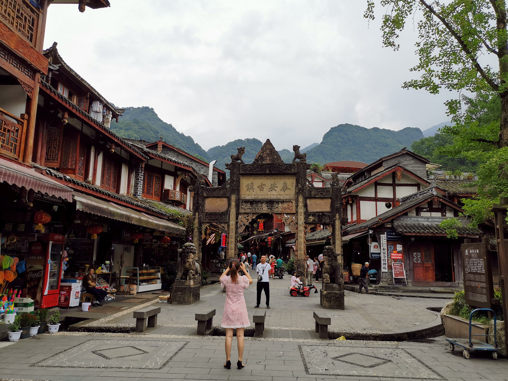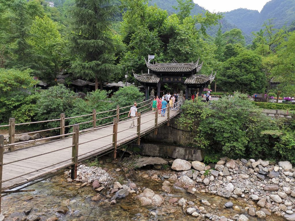 前两句是余秋雨为当地题写的旅游宣传语,园内的滑竿工身着的红色背心的背后,就印有这两句