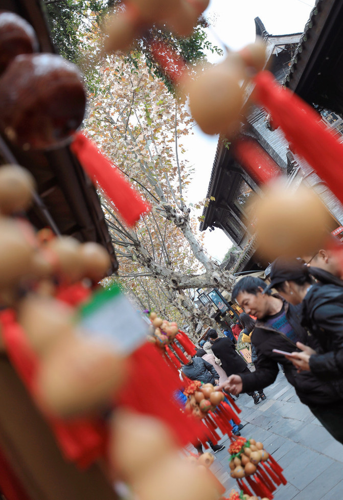锦里古街有人还卖糖葫芦,也有画糖人的,卖古玩的,卖纸扇的,到处都是。