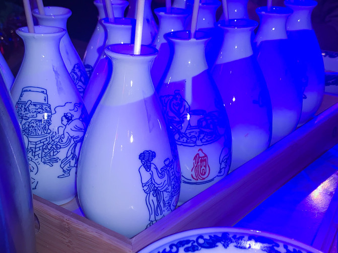 别院里的柔情,藏在各处别出心裁的布置里,桌上的插花、绚烂的灯饰、整面的藏酒墙,清一色的 景德镇 青花瓷餐具以及中式屋檐……,是文化与潮流的融合,颠覆对普通酒馆的认知,我仿佛在参加一场绚烂的艺术展览。