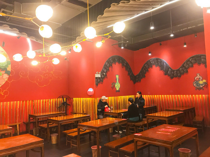 成都瓜串串(金房苑东路店)以红色为主调,木桌子木板凳,给人一种舒适感,场地宽敞,功能分区清晰,方便客人取菜就餐。