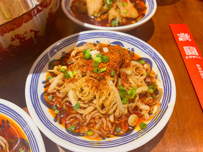 成都瓜串串(金房苑东路店)冒千层肚:千层肚和豆芽搭配一起吃口感很好,肚丝又细又弹,恰当的麻和辣在嘴 巴里 不停交织。