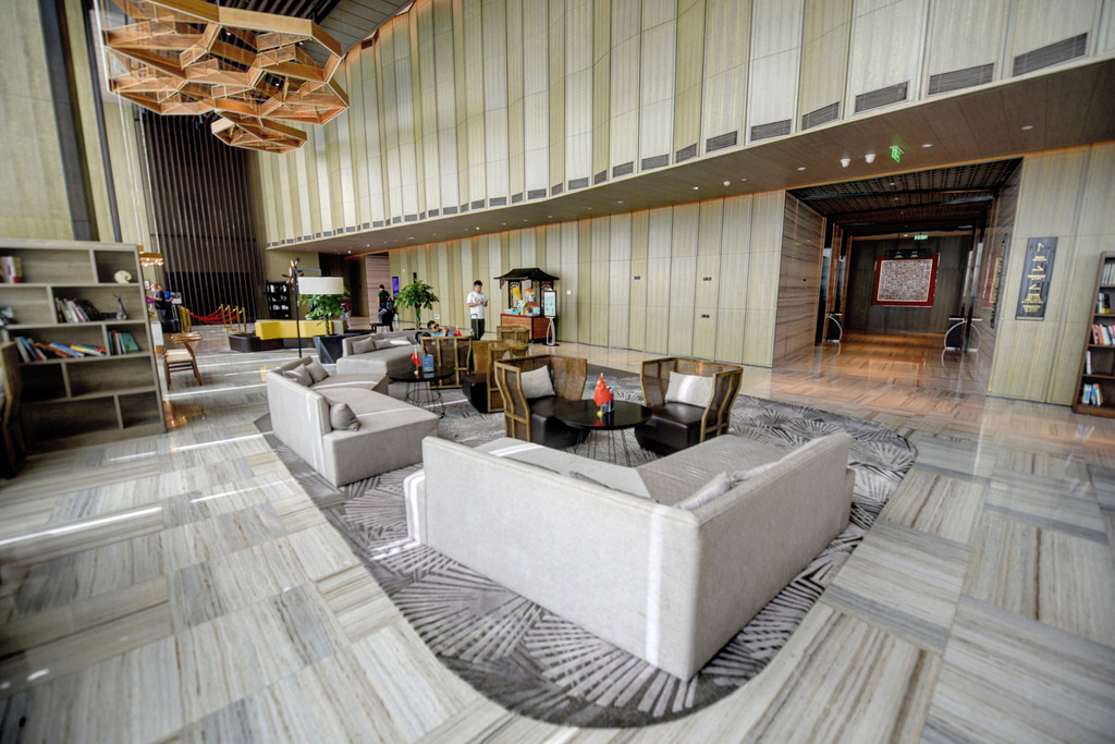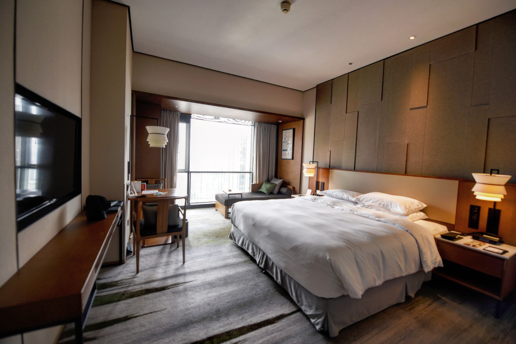 入户之后并不是酒店的大堂,而是很大的客人休息区,要前往酒店的大堂需要乘坐电梯到32楼,这种“空中大堂”的设计被很多新派酒店所喜爱,因为酒店除了住客之外,还有不少前来与会、参展的客人,要是将大堂设计在一楼有时会出现拥堵,这样的设计不仅缓解了这个问题,还在一定程度上保护了客户的隐私。在大堂办理入住很顺利,前台很热情,如果来太早房间还没有打扫出来的话会帮忙保管行李,服务非常贴心。