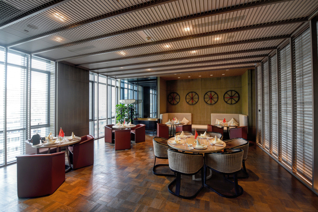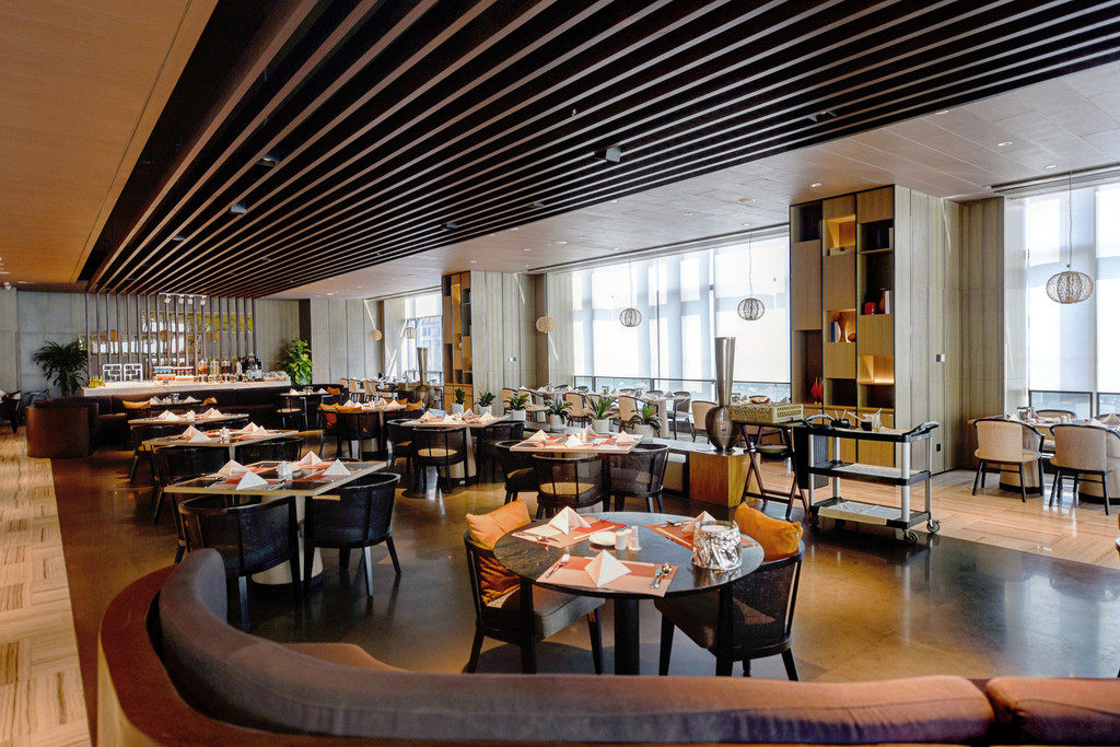 天空吧的背后是荟聚西餐厅,这里可谓是整个酒店最常用的餐厅,不仅吃西餐是在这里,吃自助也在这里,吃早餐同样在这里。餐厅拥有各种型号的桌子,四人方桌、多人圆桌以及适合家庭聚会的长条形桌子一应俱全,虽然下午的时候显得空荡荡的,但是只要一到饭点,无一例外地全是人,特别是靠窗的位置和长条桌,没有预定的话基本坐不到,这么有人气是因为这里的服务和味道都不错。