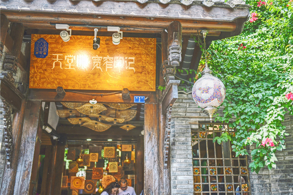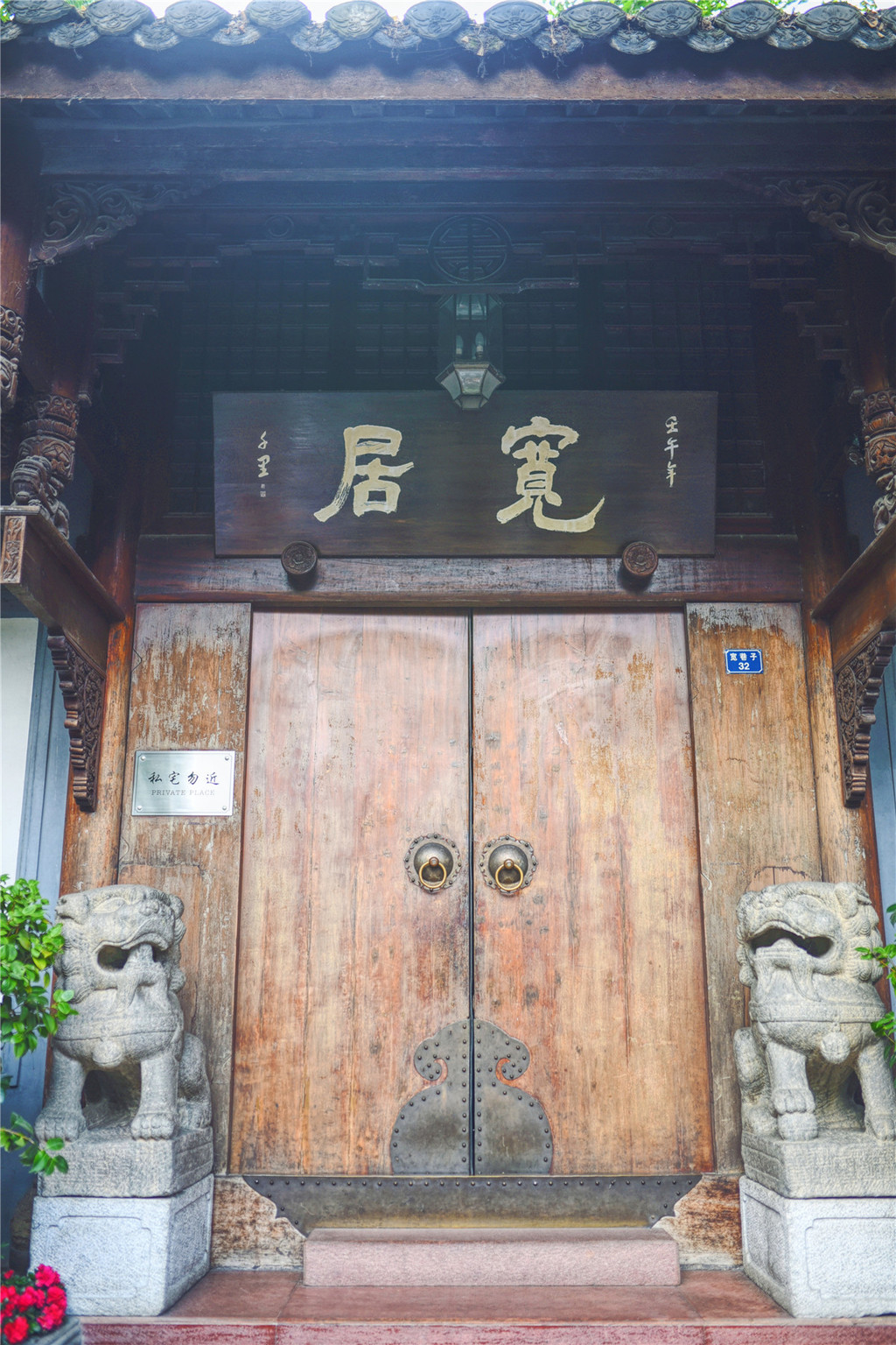 行走巷子里,非常的惬意,绿意盎然的巷子两旁都是鳞次栉比的青砖黛瓦,是几百年前的沉默。四处都可以看到旧时候的建筑,走在11号的时候,看见一个拱形宅门,青砖砌成带有弧形。上面书“恺庐”,是宽窄巷子的标志性门头。“恺庐”的意思是“快乐自在的居住地”。 盛夏时节,树木茂盛,有种“锦官城外柏森森”的感觉,值得一去拍照。