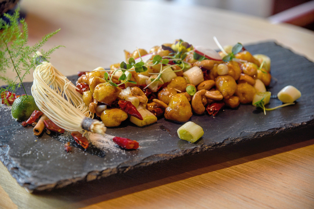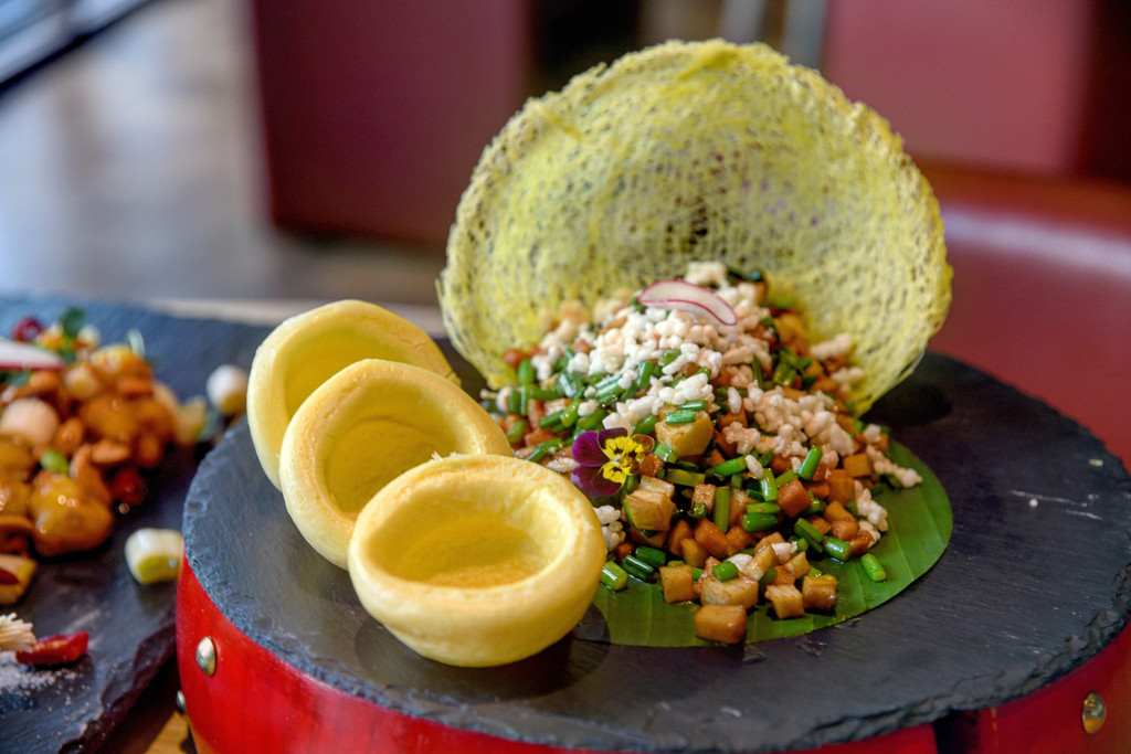 毕竟是川菜,当然要来一份钵钵鸡,这个属于川菜系的特色名小吃,从清代流传至今已有了上百年的历史,这个钵钵鸡的“钵钵”,其实就是瓦罐,正牌的钵钵外面都是画着瓷质龙纹,而钵内则盛放配以麻辣为主的佐料,菜品在特殊加工后用签串起来,晾冷后再浸于钵中,食用时自取自食,麻辣入味,深受当地人的喜爱,而酒店的钵钵鸡在保留其内涵的同时也稍加装饰,接地气的小吃也显得“高端”起来。