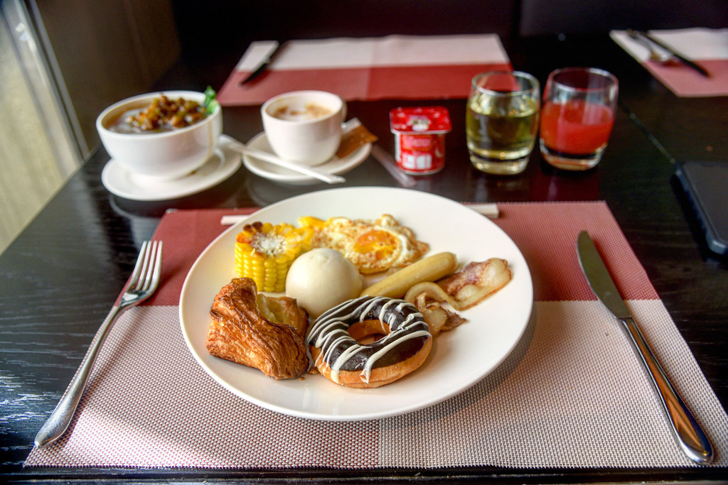 第二天清晨,可以回到32楼的西餐厅吃早餐,酒店早餐供应的时间一直到10点钟,要是想睡个懒觉再下去也未尝不可,除了有常规的肉肠、培根之外,还可以来一碗热腾腾的面条,当然还有甜品可以选择,虽然大清早吃甜甜圈有点罪恶,但是还是没忍住,因为真的很好吃,小朋友绝对喜欢。