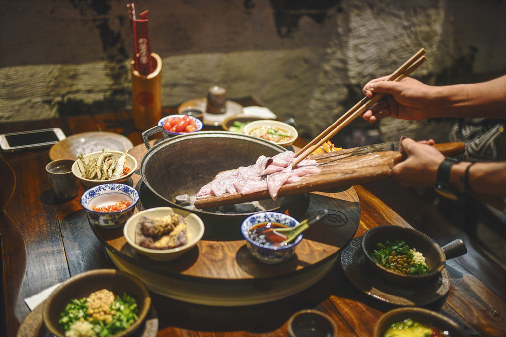 既然旧时生活辛苦,那么就一定要好好生活,我们一定要在这里点最喜欢的美食。店内上菜非常注重仪式感,先是石锅底下鹅卵石烧热,然后服务员一起喊一声“石来运转”,那气势很猛呀,服务的小哥哥非常热情。我们看到已经处理好的鱼片倒入烧热的鹅卵石上,然后滋啦作响的鱼片已经被烫成半熟,再倒入烧制好的滚汤。这样已经去除骨头的鱼片一口下去,鲜嫩无比,配上汤里的酸,非常的好吃。