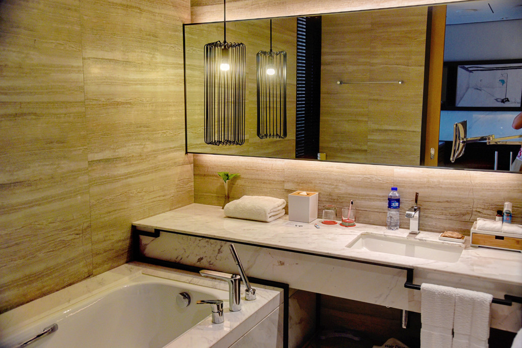 房间的浴室也很宽敞,所有的酒店备品一样不落,如果你想舒舒服服地泡个澡,可以发现酒店不仅提供了浴盐,还有一个小枕头,忙了一天之后泡个热水澡,也能够缓解一天的疲劳了。在洗手间内也能看到酒店提供的免费矿泉水,非常周到。