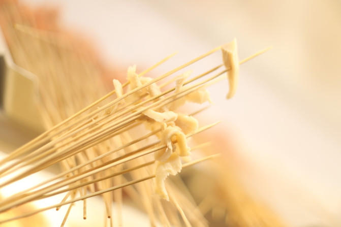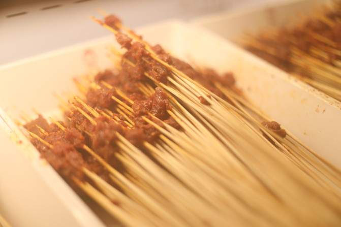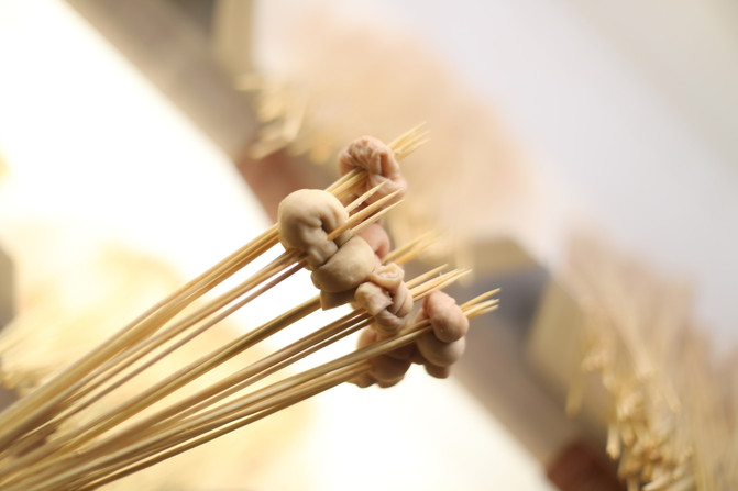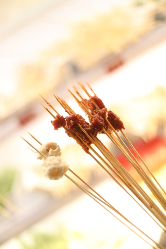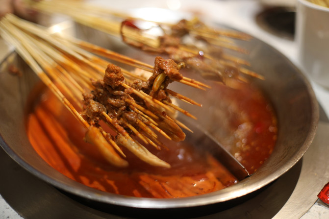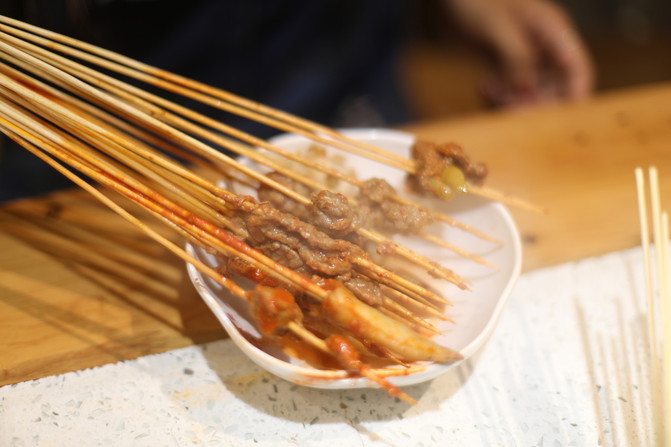 牛肉串是麻辣烫中最受欢迎的食材, 成都 人吃麻辣烫,总会大把大把地拿牛肉串。