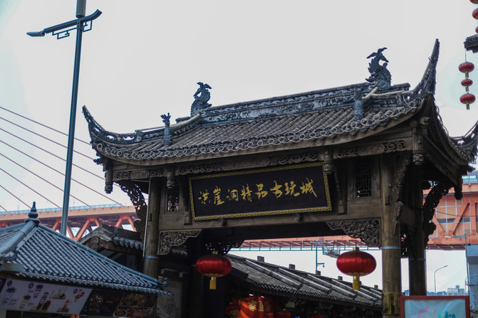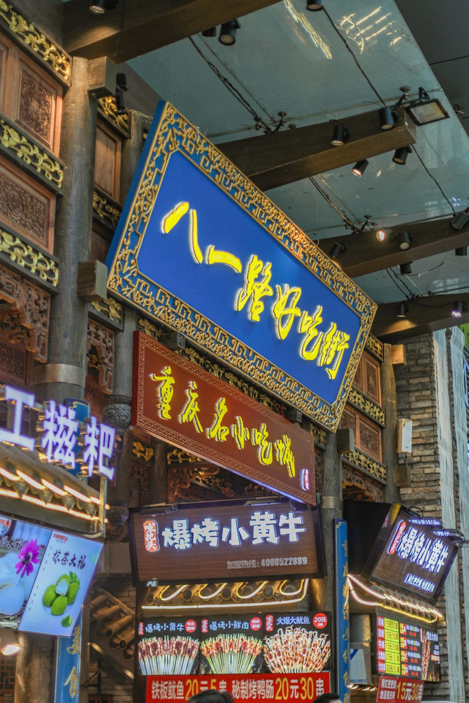在解放碑步行街,也有特色的小吃街。小吃街的装修颇为复古,门前的红灯笼,墙上的各种雕塑,都有一种传统的味道。
