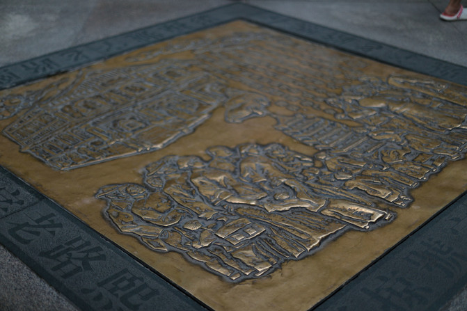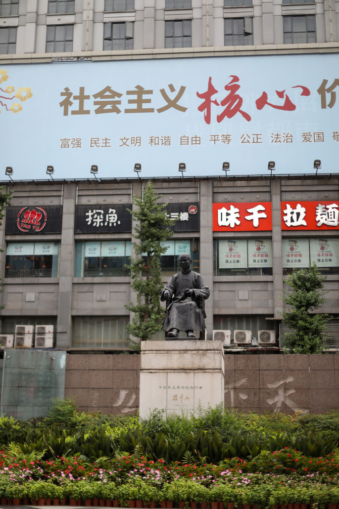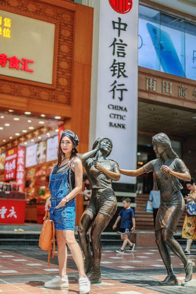 而且在步行街,还有很多有趣的景象能看到。在这里,放置了很多的铜像,从民国服饰的铜像到孙 中山先生的铜像,都能在这里看到。铜像也组成了那过往的味道,加上地板上镶嵌的铜板,那带着历史味道和风霜,带着些许青色的铜雕很有历史的味道。
