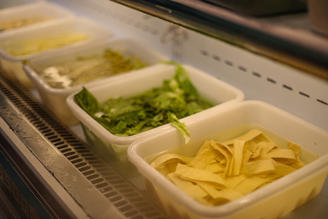 这里的食材都摆放在开放式的大保鲜冰箱中,食客可以自己拿取。