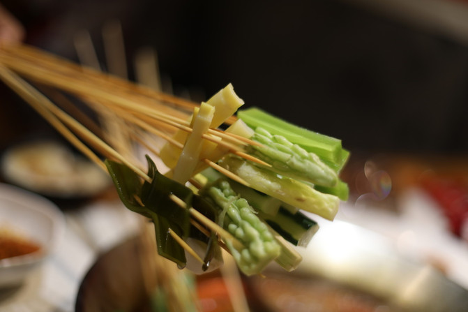 在这里,牛肉串也有各种不同的口感。有纯牛肉的肉串,也有包裹了指天椒、鱼腥草、芹菜等各种不一样的食材的牛肉。