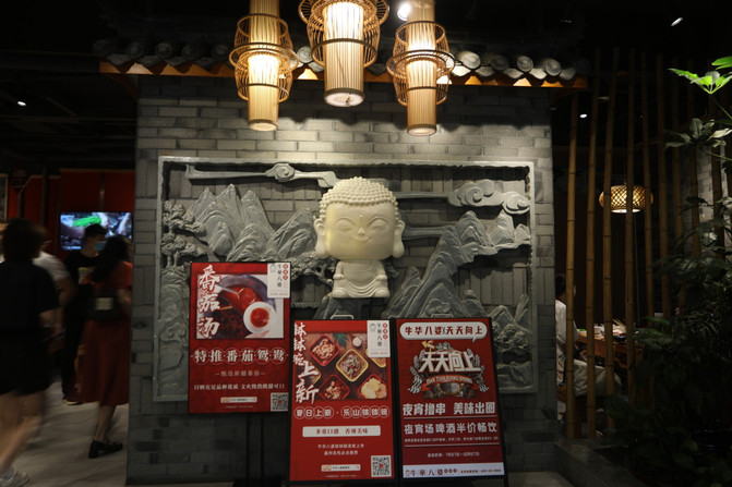 牛华八婆麻辣烫最早创立于距离 成都 不远的 乐山 ,因此这家店的标志也用了 乐山 大佛的Q版形象作为标志,非常可爱。