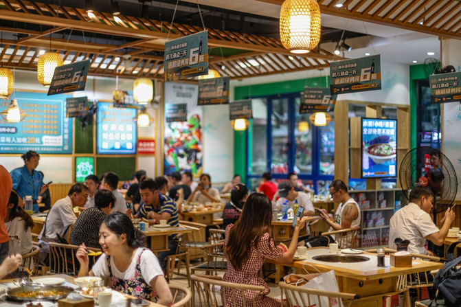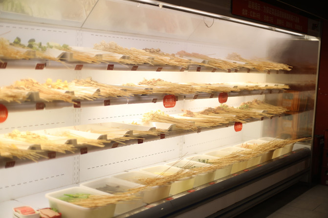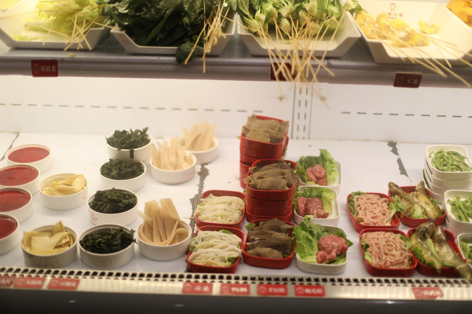吃完了肉,再次把火锅煮开沸腾,就能加入各种新鲜的蔬菜了。在这里所有的蔬菜放在开放式的保鲜冰柜中,可以自取。无论是爽脆的青笋或是鲜甜的白萝卜,搭配锅底都非常合适。最后再来上一份免费的西瓜,就是饭后小小的幸福。