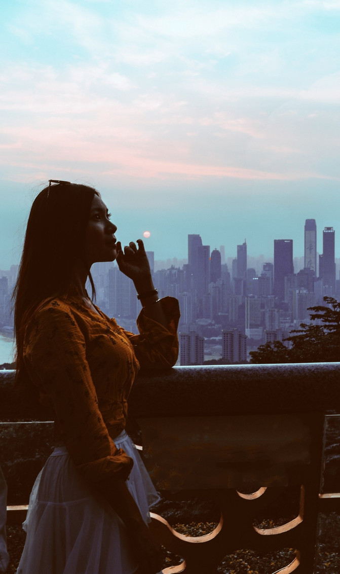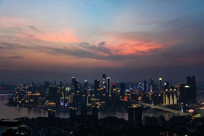 在顶层的观景台,能看到整个渝中区的景色,来到这里,看着夕 阳西 下,看着渝中区灯光亮起,灯光让这座城市的上空,让这里的江面变得璀璨,非常迷人。