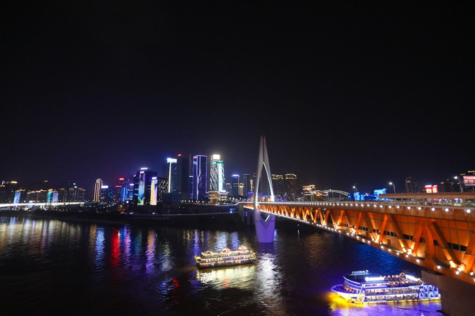 在洪崖洞的顶层,能看到长江和嘉陵江的美景。时光来到晚上,江面上各种灯光的流光溢彩,就是这里极美的风景。游船经过,加上了灯饰的游船破开江面,也是一道美好的风景线。