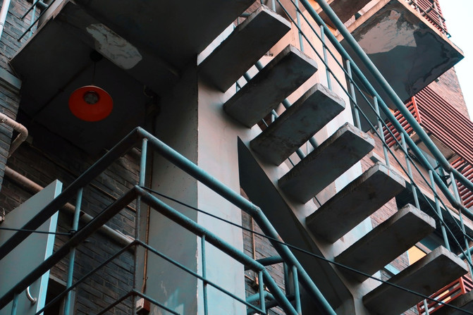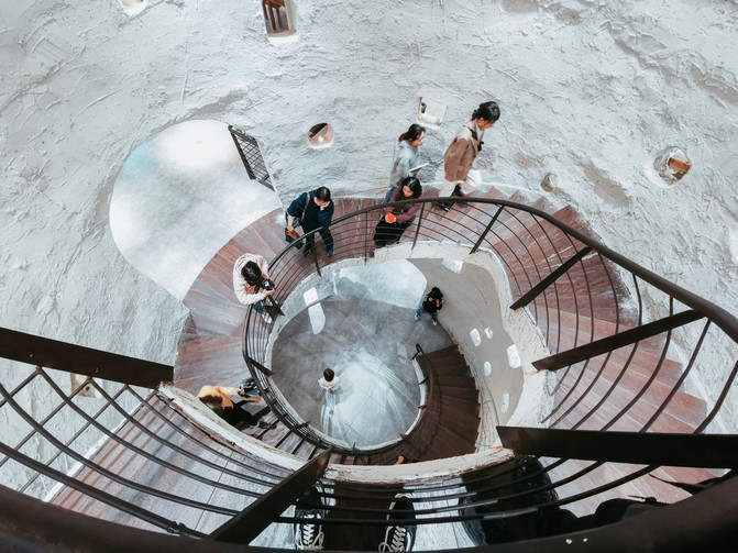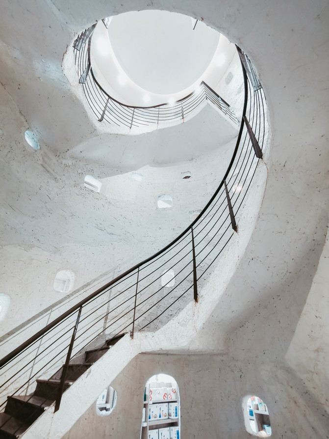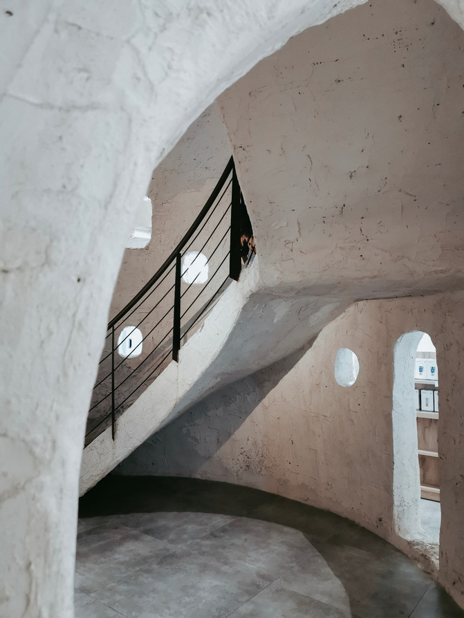 螺旋式的楼梯盘旋着,无论从上往下看俯拍还是从下晚上仰拍都很不错,地穴工业风设计,非常出片。