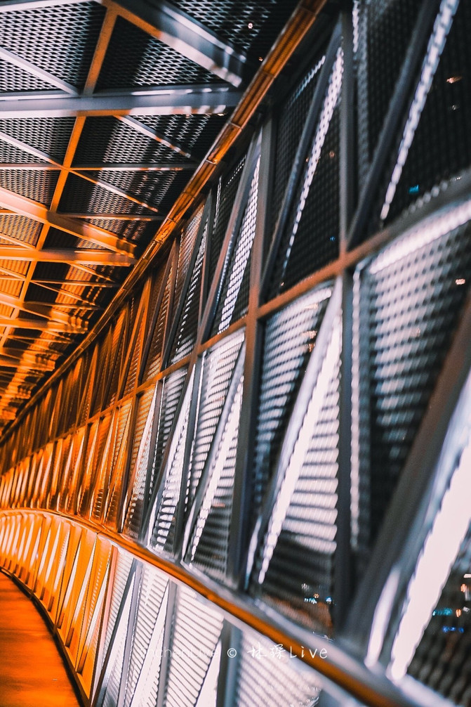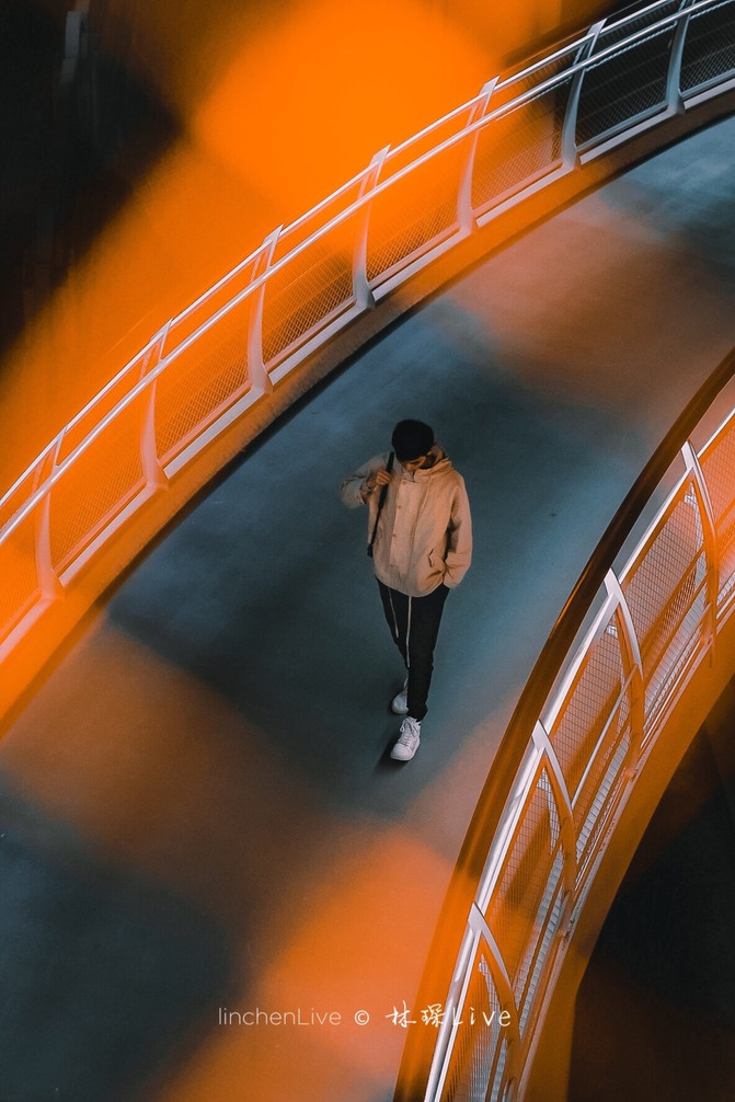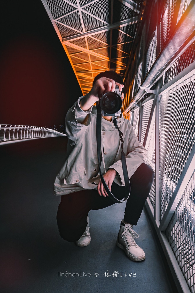第一个如上图,在桥的铁网旁,蹲下摆拍或者拿上道具 比如 荧光棒、帽子、面具、相机等对着镜头,铁网的光会在橙和白色之间变化,最好等到既有橙光也有白光,效果更佳。