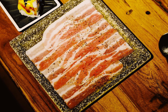 牛五花上是先码了酱汁吃起来更有味道,比较厚需要多烤一下。