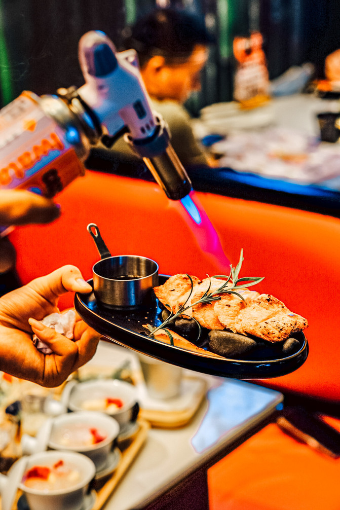 烧烤就是在一个角落里面有专人现烤的,烤好了马上端上来就可以直接吃了,不用自己慢慢烤那么麻烦。