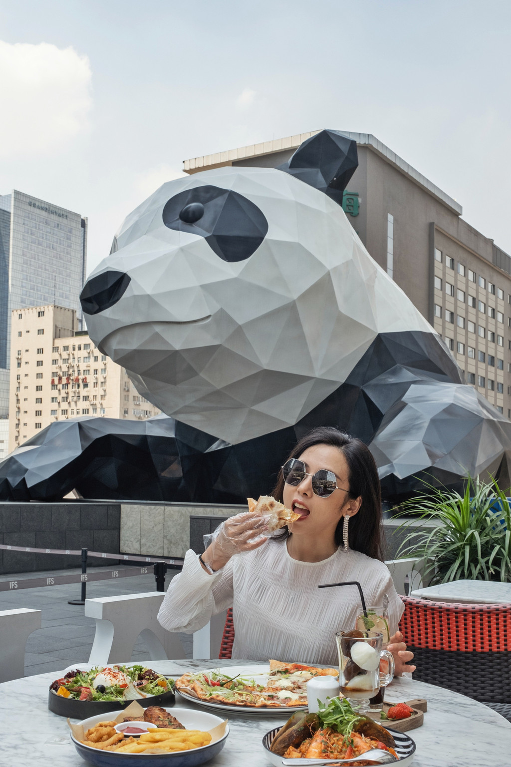 如果要在这个“宇宙中心”里再选一个中心,那肯定是雕塑家劳伦斯·亚振兹创作的户外艺术装置大熊猫。艺术家本人为它取名为“I AM HERE”,但市民们亲切地称它为“爬墙熊猫”。