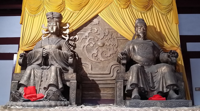 二圣殿中央供奉唐高宗李治和武则天真容铜像。这里讲述了中国历史十分罕见的现象:皇帝和皇后同朝共事,掌握朝政。