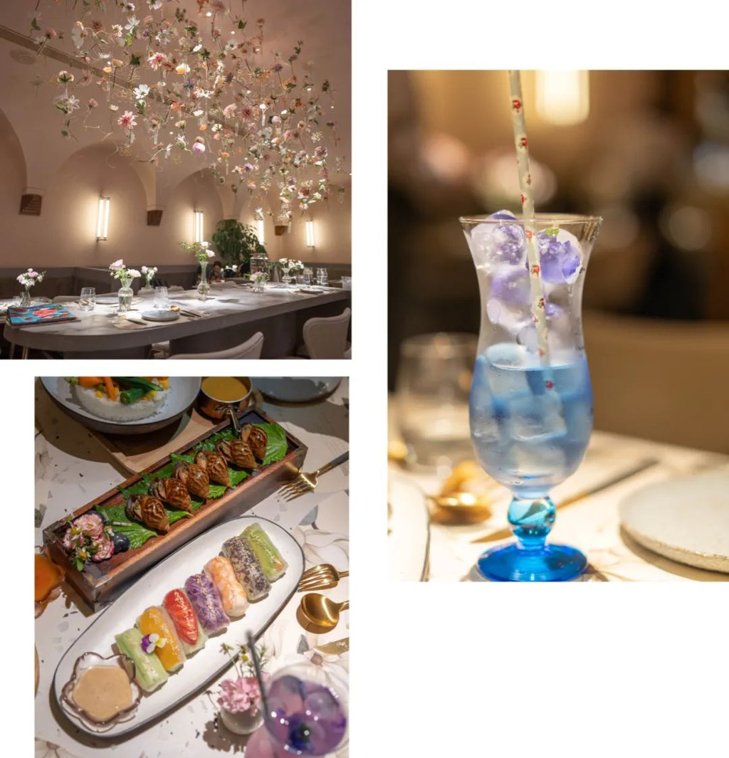 花厨并不是徒有其表的网红餐厅,我们点了双人经典套餐,花厨彩虹卷、香草烤三黄鸡、桂花咖喱猪软骨都非常好吃,饮品蓝蝴蝶一定要点,加入柠檬汁变色的一瞬间实在太美太治愈了。