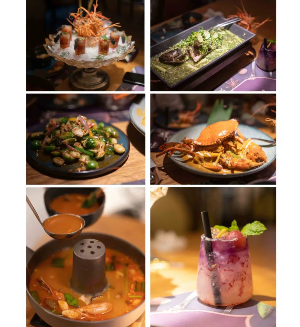 另外给大家推荐我很喜欢的一间泰式料理——Thai,就在七楼雕塑庭院旁边。这间店刚开业不久,但是酷爱泰国料理的我已经来过两次了,实在是味道征服了我。鲜虾刺身是必点菜品,剪掉虾尾一口下肚,满嘴酸辣脆爽实在太过瘾了;黄咖喱炒蟹奶香味浓郁,蟹的品质也很不错,搭配米饭就是人间美味;明炉珍珠斑完全是我的菜,鱼肉鲜嫩,酸辣带点甜口,味蕾被深深的满足了,另外它家的碳烤猪颈肉和泰式饮料也值得尝试哦。