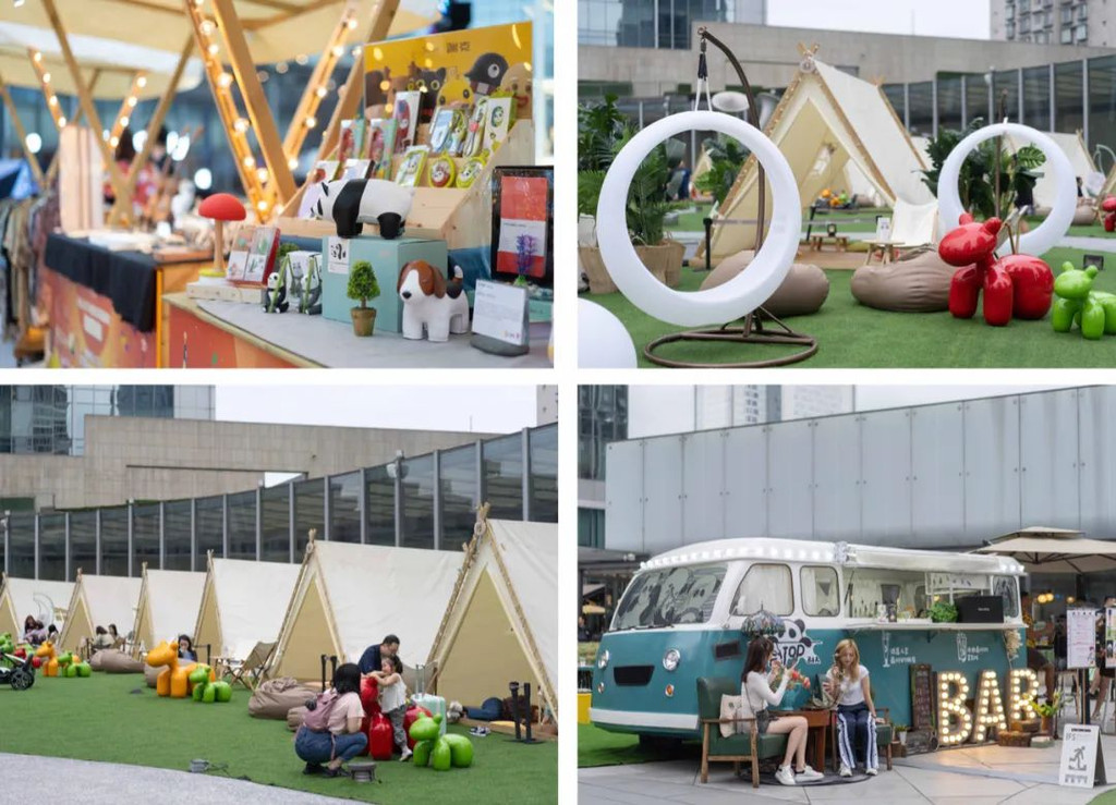 9月27日之前,如果大家遇到周五、六、日到成都IFS,一定要上到七楼的雕塑庭院。每逢周末,这里到了夜晚就会变身夜间高空集市,集合了特色摊铺、文创市集、乐队表演、户外影院以及定制的露营帐篷。