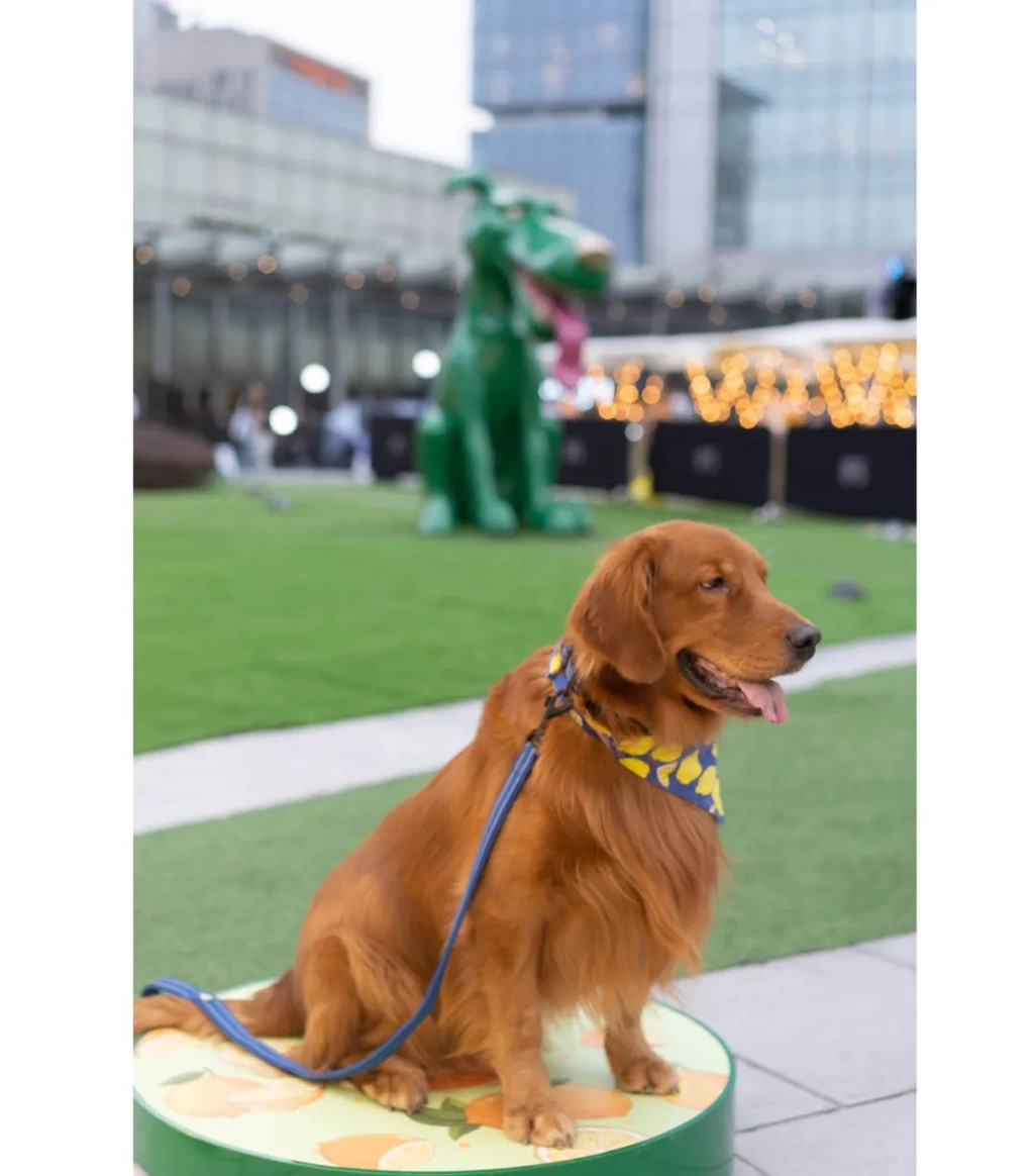我们在广场上还偶遇了特别员工——“菠萝一家”,它们是7只金毛寻回犬,本职工作是防爆。每天18:30-19:00,它们会轮岗在雕塑庭院与游客合影。“菠萝”和身后周春芽雕塑作品的《绿狗》神同步,太好玩了。