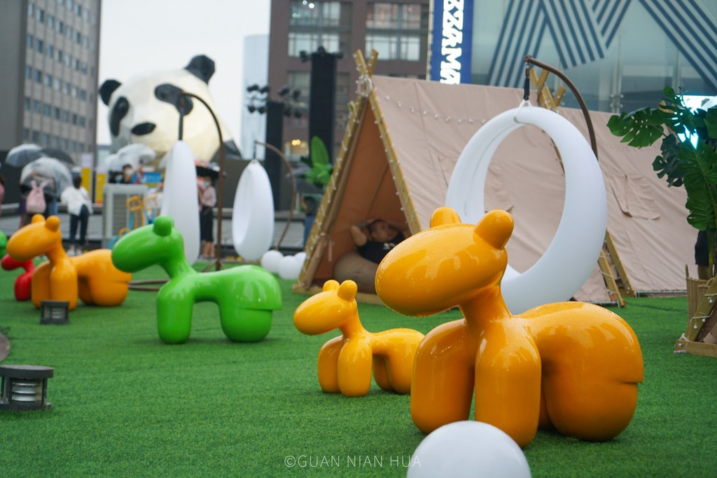 这次在雕塑庭院正好赶上了空中市集,创意手工、小吃零食,现场还有联名的火锅底料,立马买了两包带回家。7楼除了看熊猫,雕塑庭院也很值得一逛,在这里展出了10名国内外知名的艺术家的雕塑作品,每一个都极具特色,充满了艺术气息。