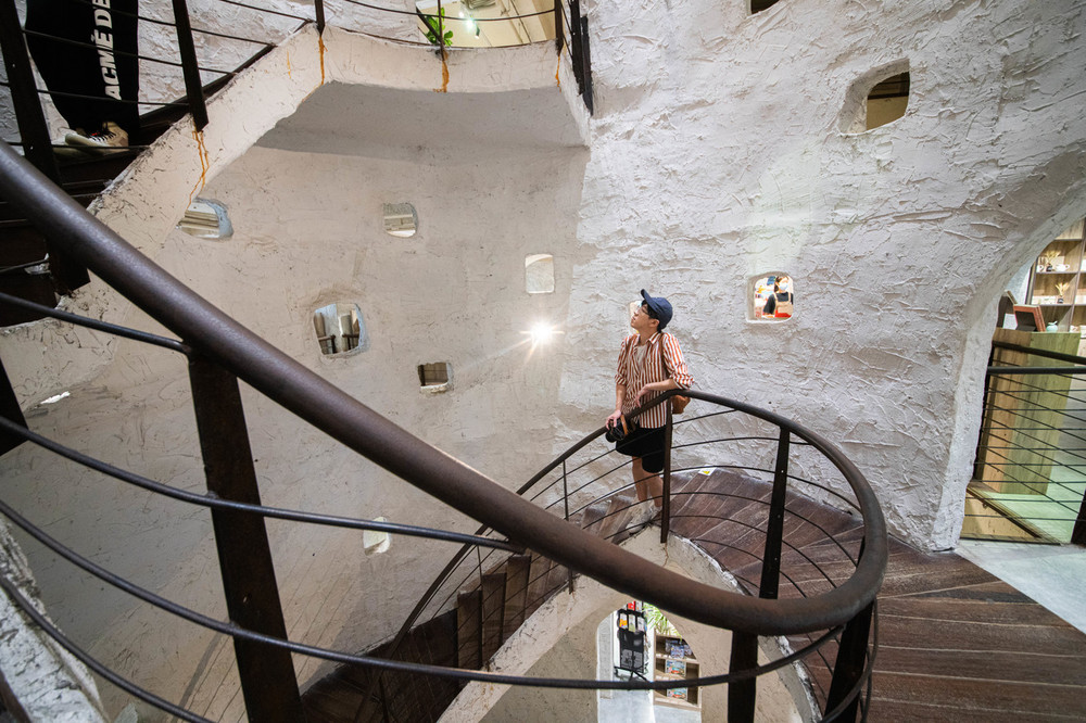 几何书店的概念起源于 青海西宁 ,分为重磅阅读、雪域净土、天空之城、时光书馆、空间之门和重拾生活。不过几何书店在不同城市也是拥有不同的风格,这次去的是距离春熙路不远的猛追湾店,它最吸引人的点是内部的一座旋转楼梯,整整三层,又被称为“九层妖塔”。