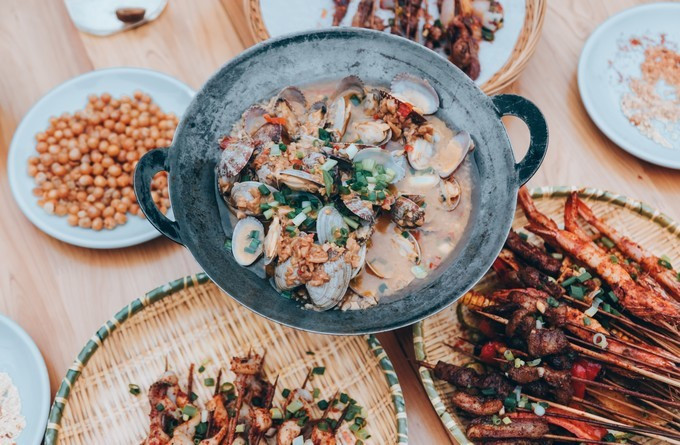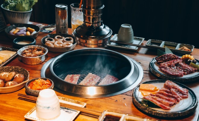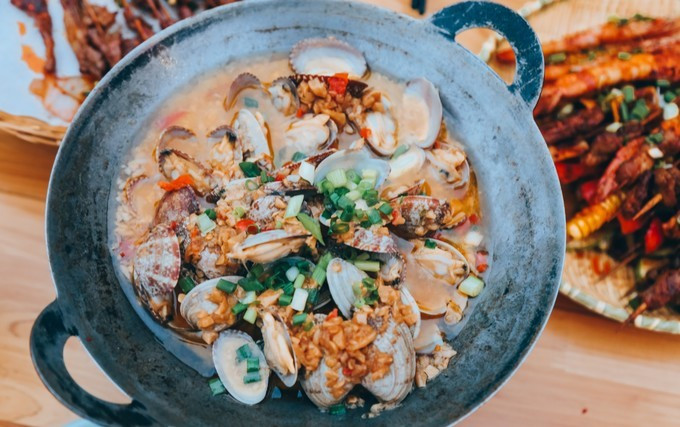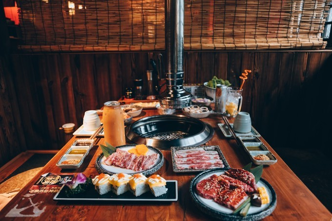 食材摆满一整桌,自己烤食,参与感十足。