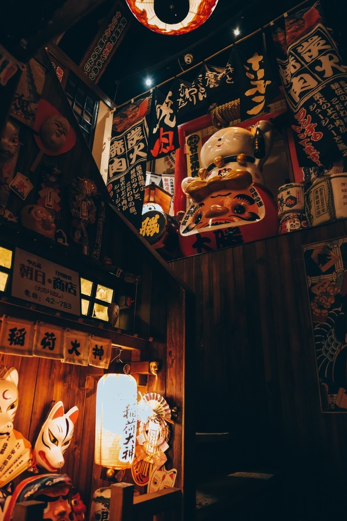 木质楼梯上二楼,各种半帘、招财猫充斥,日式小元素真的太可爱了。