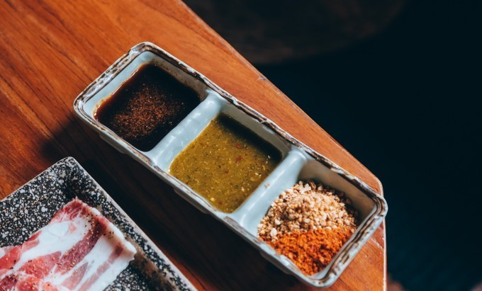 蘸料有3种,中间是很特色的有点泰式酸辣口的,左右两侧各是传统的 四川 干碟和日式照烧汁蘸料。
