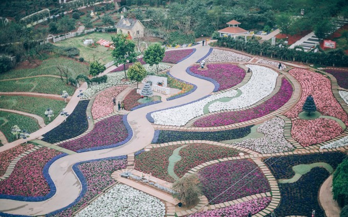 这一大片土地上栽种了各种各样的花朵,颜色各异非常的好看。道路九曲回肠状,所以片区得名。