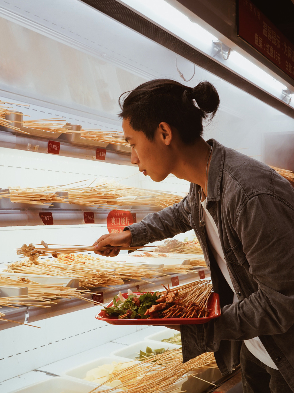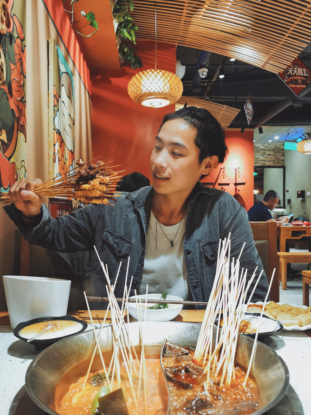 成都稍微火热的串串店,装修都很有川渝特色,恰好今天的衣服和灯光很配,拍点照片看看吧。