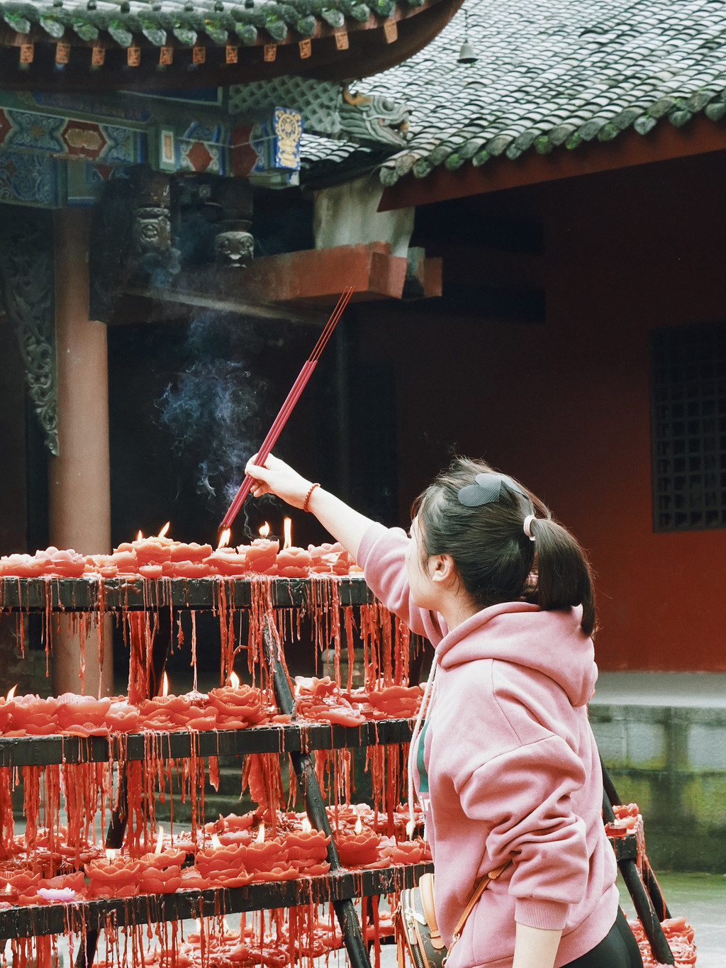 第一站我们先去了龙泉山石经寺,隐于山林,方寸间自有禅意,这座千年古刹的别致一点不输别处,红墙绿树的景色之中,有楼宇屋檐露出,点燃的红烛随风跳动,如成都这地界一样舒适安逸里带点红和辣。