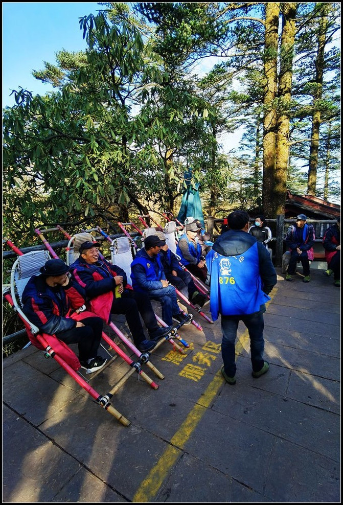 峨眉山-雷洞坪正在路边休息揽客的滑竿轿夫。峨眉山滑竿,是为游人代步的一种交通工具。它不仅为游人减少了登山的劳累,还给仙山增添了一道亮丽的风景。随着峨眉山游人逐年增多,为满足游客的需要,滑竿队伍也就应运而生。现在已有1000人的滑竿队伍。按单双日分为两班,统一着装,分段管理,明码标价,亮证经营,文明服务。同时对滑竿也进行了改进。改弧型竹排为四脚睡椅型。既造型美观,又坐卧舒适。