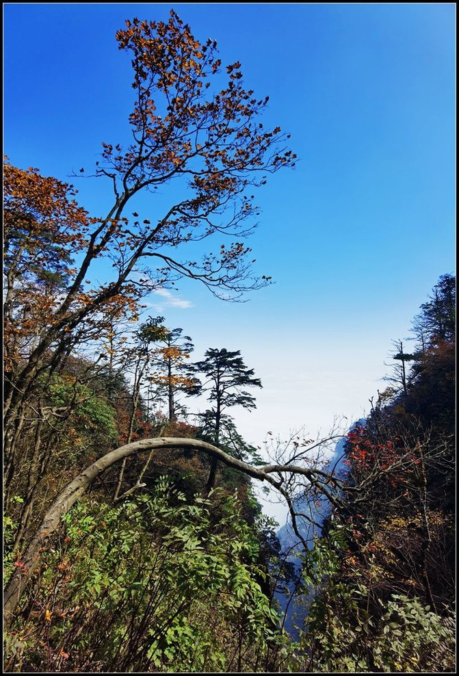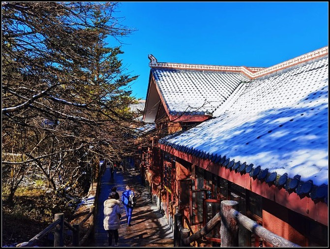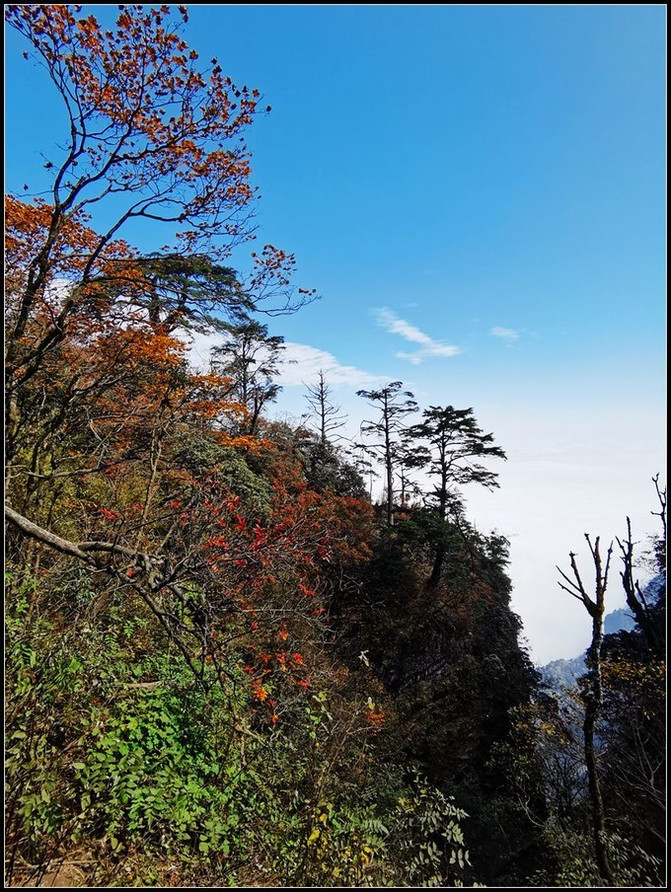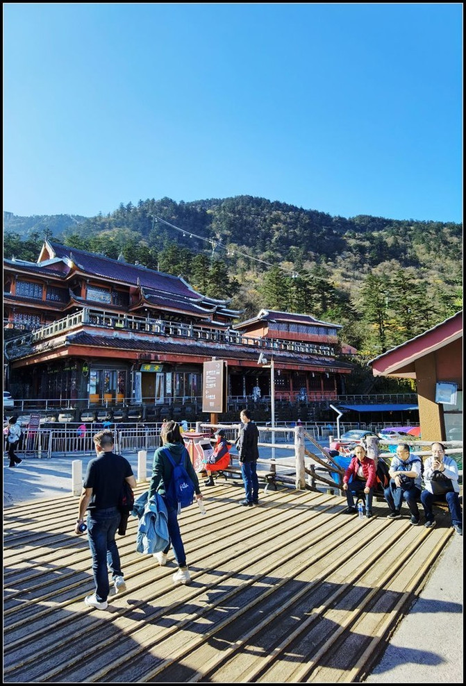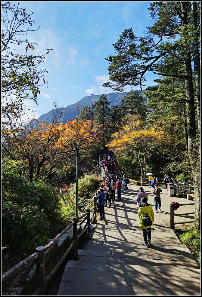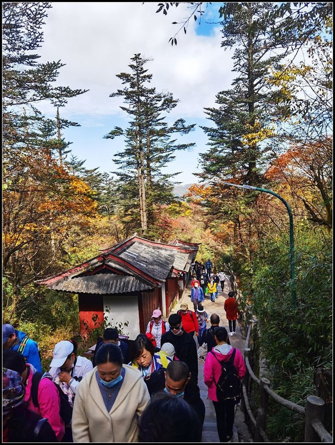 峨眉山-雷洞坪在雷洞坪下车后,需要沿着山道步行约1.5公里,才能到达接引寺缆车站。晚秋时节的峨眉山气候宜人,空气清新,景色十分迷人。
