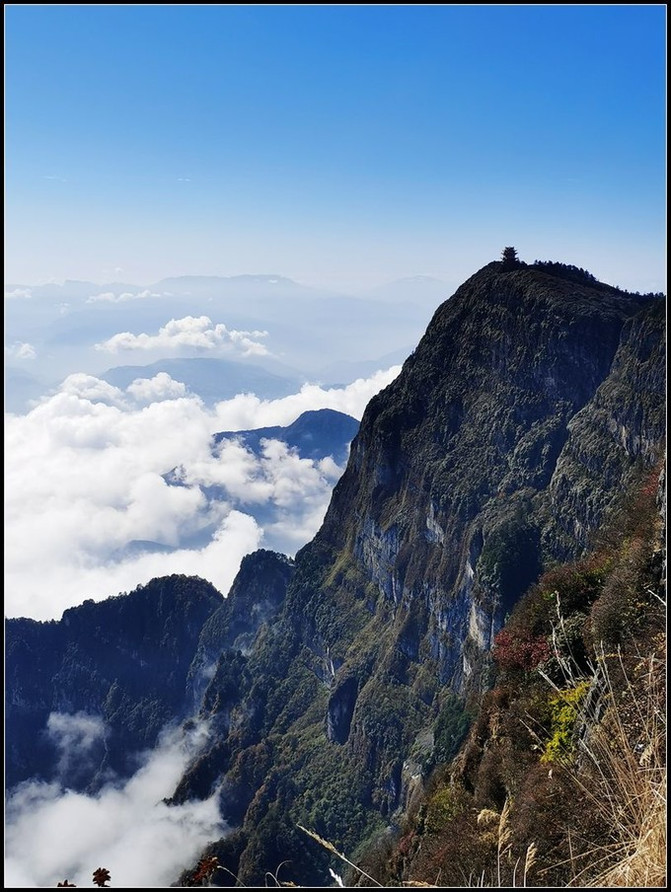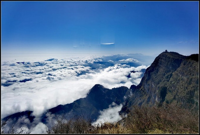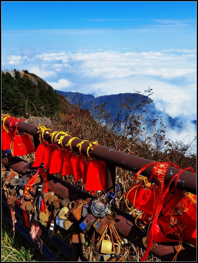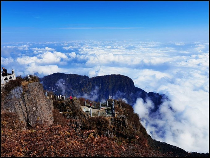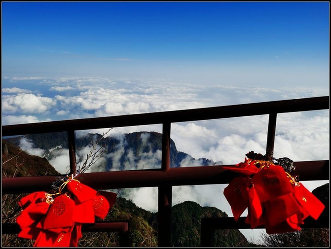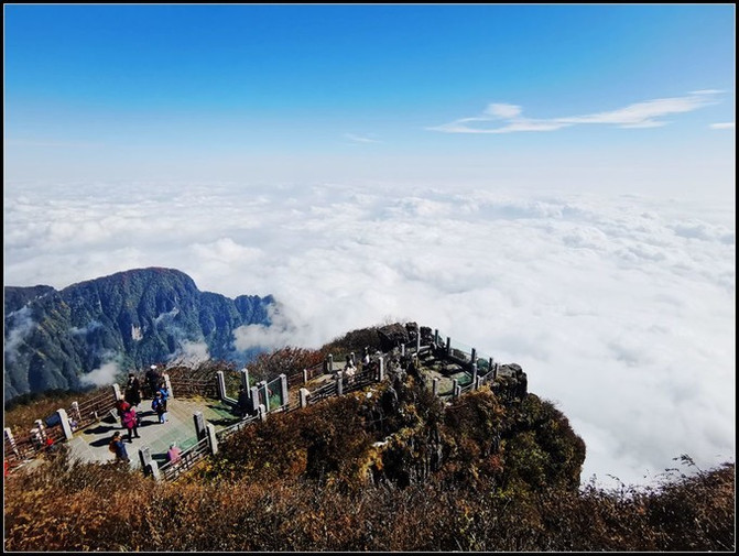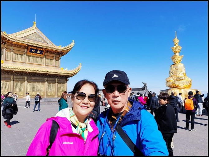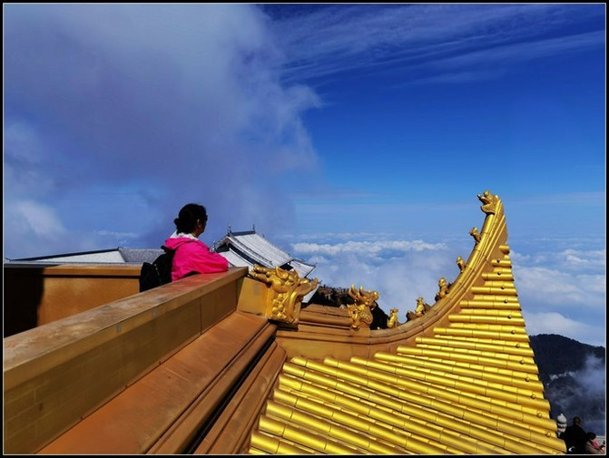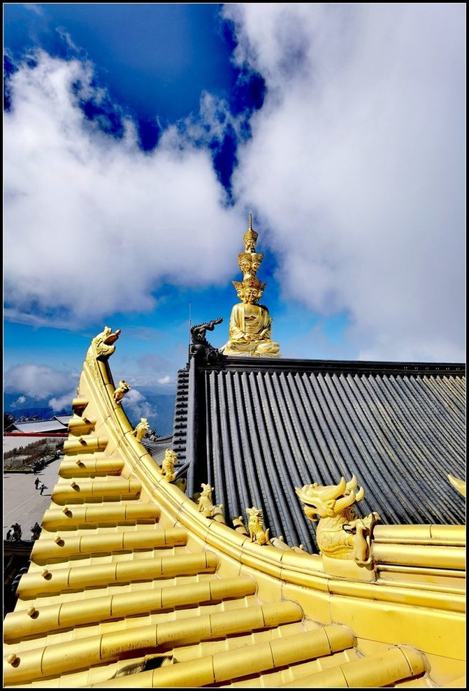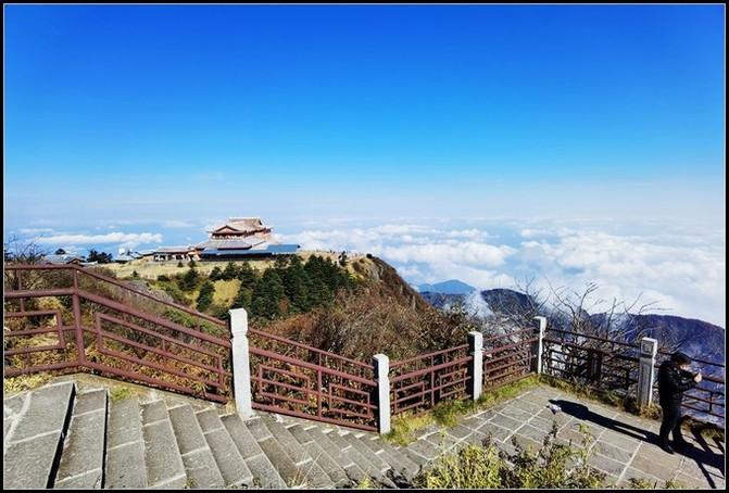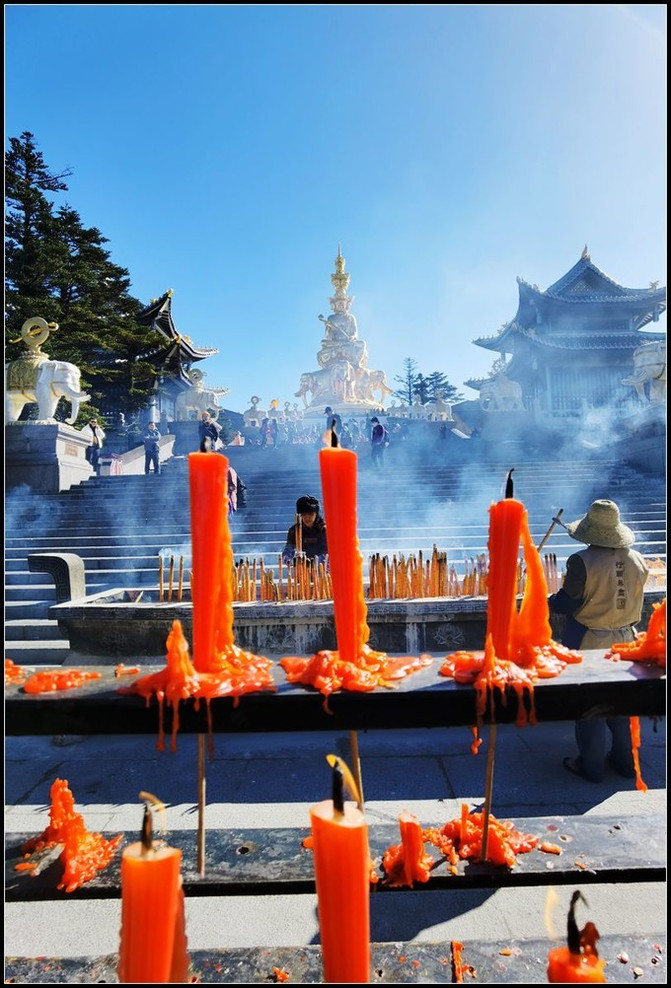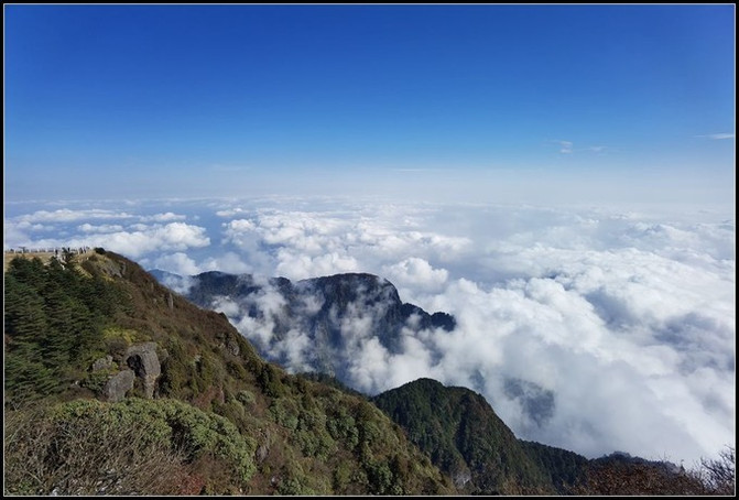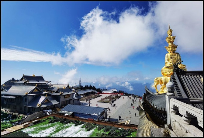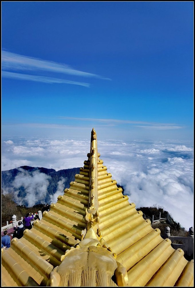 峨眉山金顶我们真的非常幸运,据当地人介绍,峨眉山金顶每个月平均只有四五天是晴天,其他时间都是阴天。我们今天赶上个大晴天,阳光普照,半山腰还出现了云海奇观。