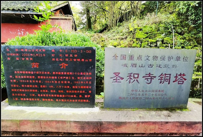 峨眉山-雷洞坪伏虎寺伏虎寺伏虎寺里的华严宝塔。这这座塔铸造于明朝万历十三年,华严宝塔是伏虎寺的镇寺之宝,为 中国 铜塔之最。这样一座精美而巨大的铜塔铸造于将近八百年前,而且是一次铸造完成,塔身没有任何拼接的痕迹。塔身呈八方形,通高5.8米,为十三级楼阁式钢塔。塔基为须弥座,上置瘦长覆钵式塔身,高96厘米,正面设塔门,额铸正书阳文南无阿弥陀佛华严宝塔,两侧联文皇图巩固,帝道遐昌,风调雨顺,国泰民安,佛日增辉,法界有情,同生净土。联旁铸守门神像各一。其余七面均铸神像6排。上接十三级八角形重槽楼阁,各级均劳佛像,共4700余尊,佛像间铸《华严经》。塔刹为葫芦形。此塔铸造精美,有较高的艺术价值。