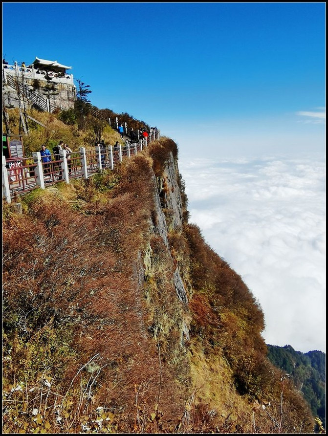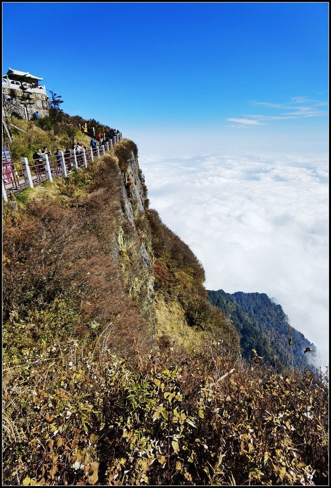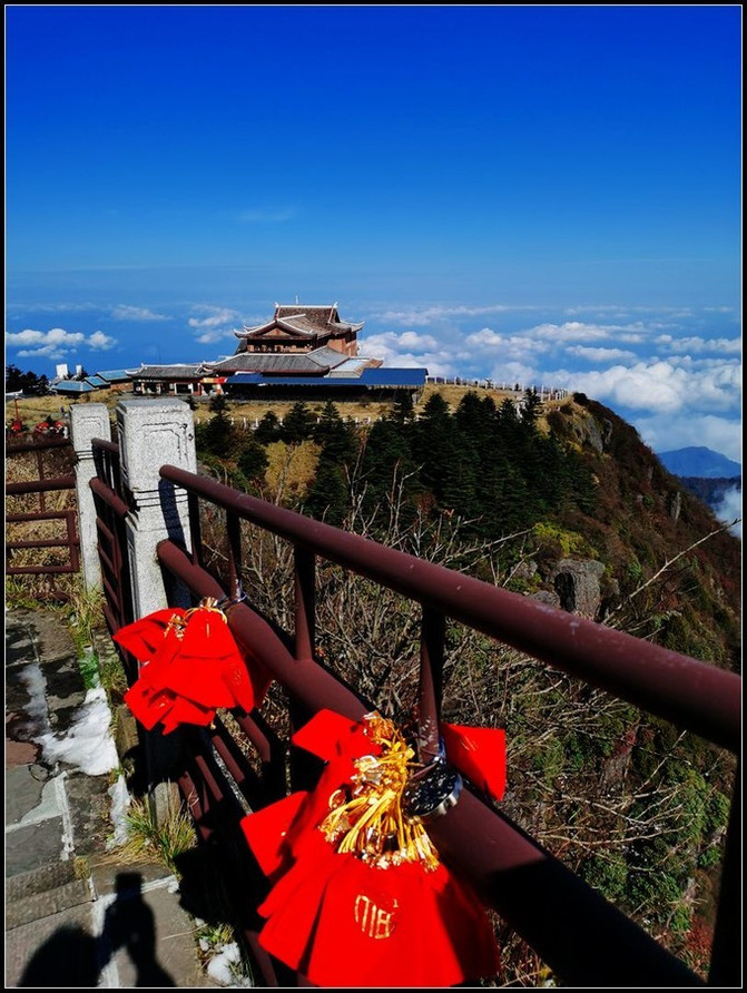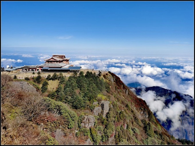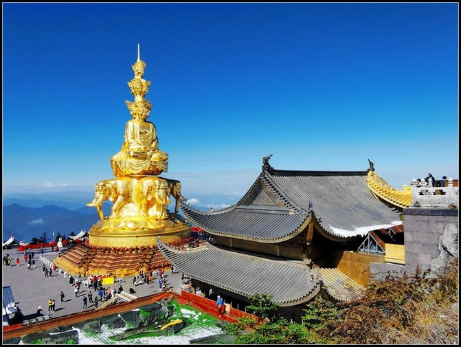 峨眉山金顶峨眉山金顶是峨眉山寺庙和景点最集中的地方,名胜云集,为峨眉精华所在。1983年被列为全国重点佛教寺院。登金顶,是所有游人香客游览峨眉、朝拜普贤的最大愿望。在这里,人们不仅可以烧香敬佛,流连于神的世界,还可以领略到大自然的神奇景观:日出、云海、佛光和神灯。