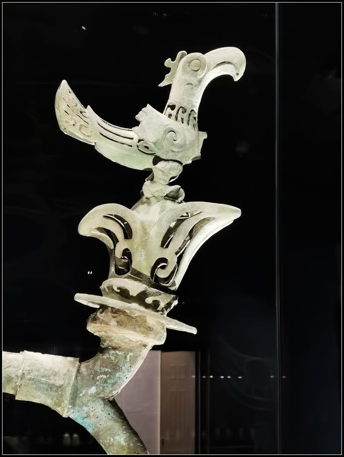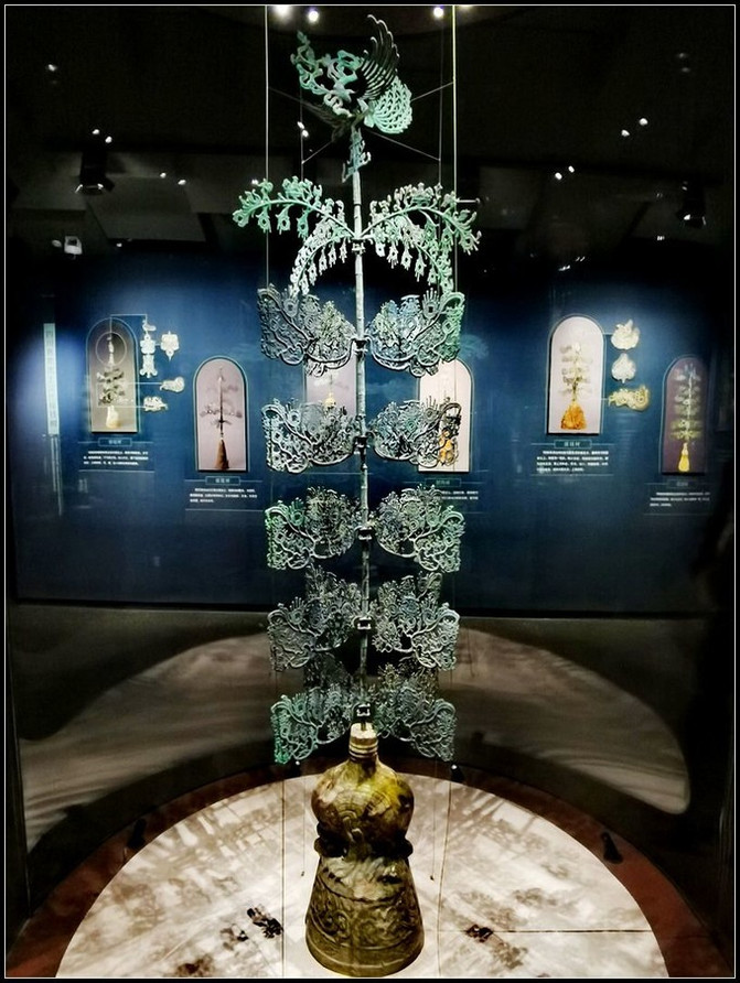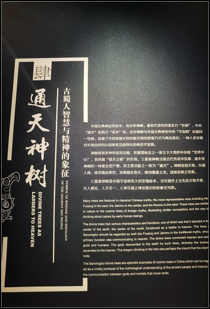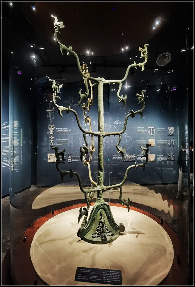 三星堆博物馆三星堆博物馆三星堆博物馆三星堆博物馆三星堆博物馆三星堆博物馆三星堆博物馆三星堆博物馆器形高大、造型生动、结构复杂是三星堆青铜器重要特点,青铜神树高384厘米,树上九枝,枝上立鸟栖息,枝下硕果勾垂,树杆旁有一龙援树而下,十分生动、神秘,它把有关古代扶桑神话形象具体地反映出来了。